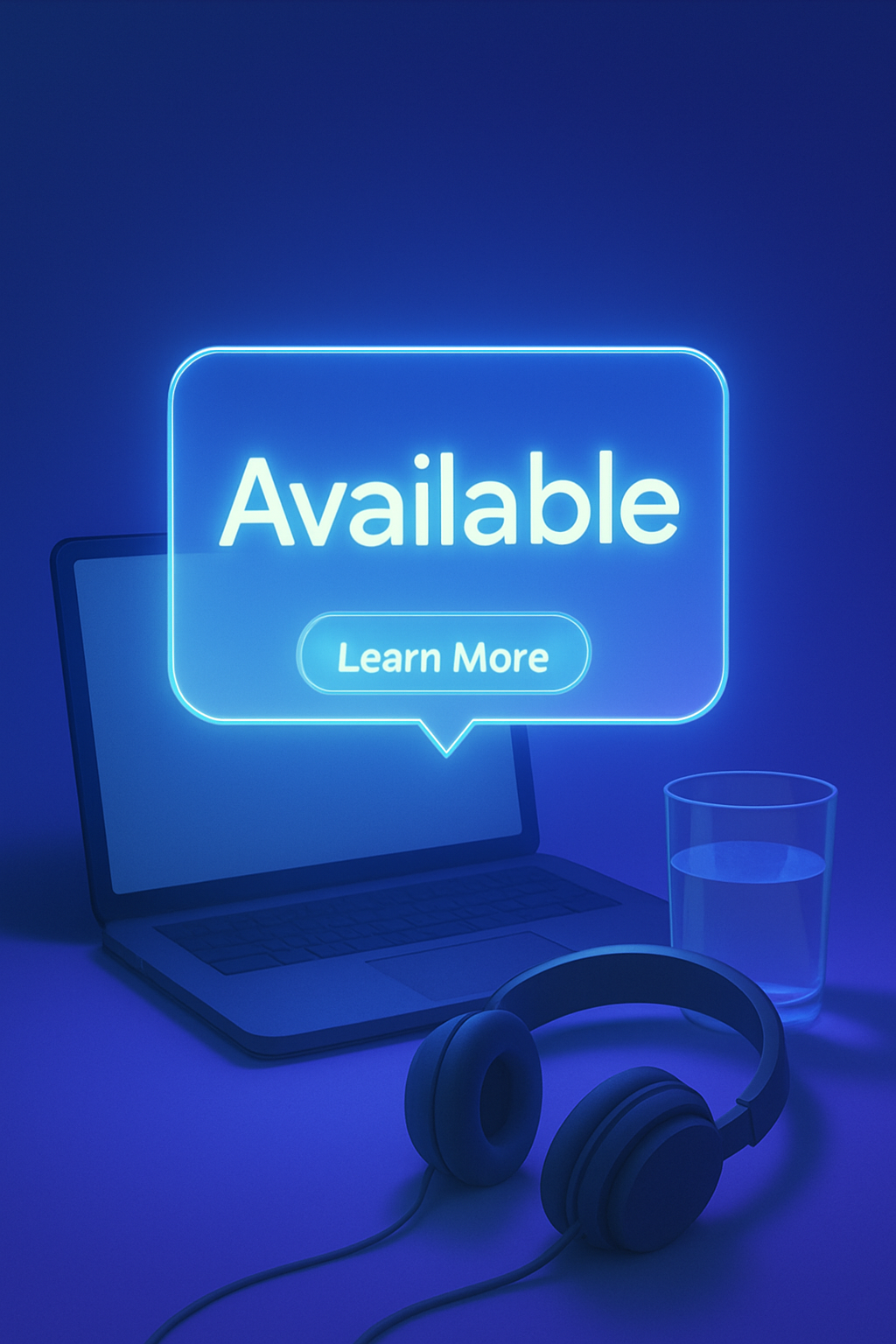 The image features a glowing 'Available' sign in a vibrant blue background, accompanied by a laptop, headphones, and a glass of water, creating a modern and inviting atmosphere.