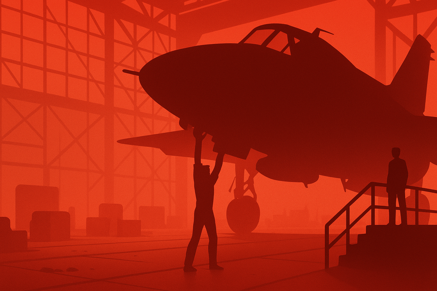 Silhouette of Aircraft in Hangar with Dramatic Red Lighting