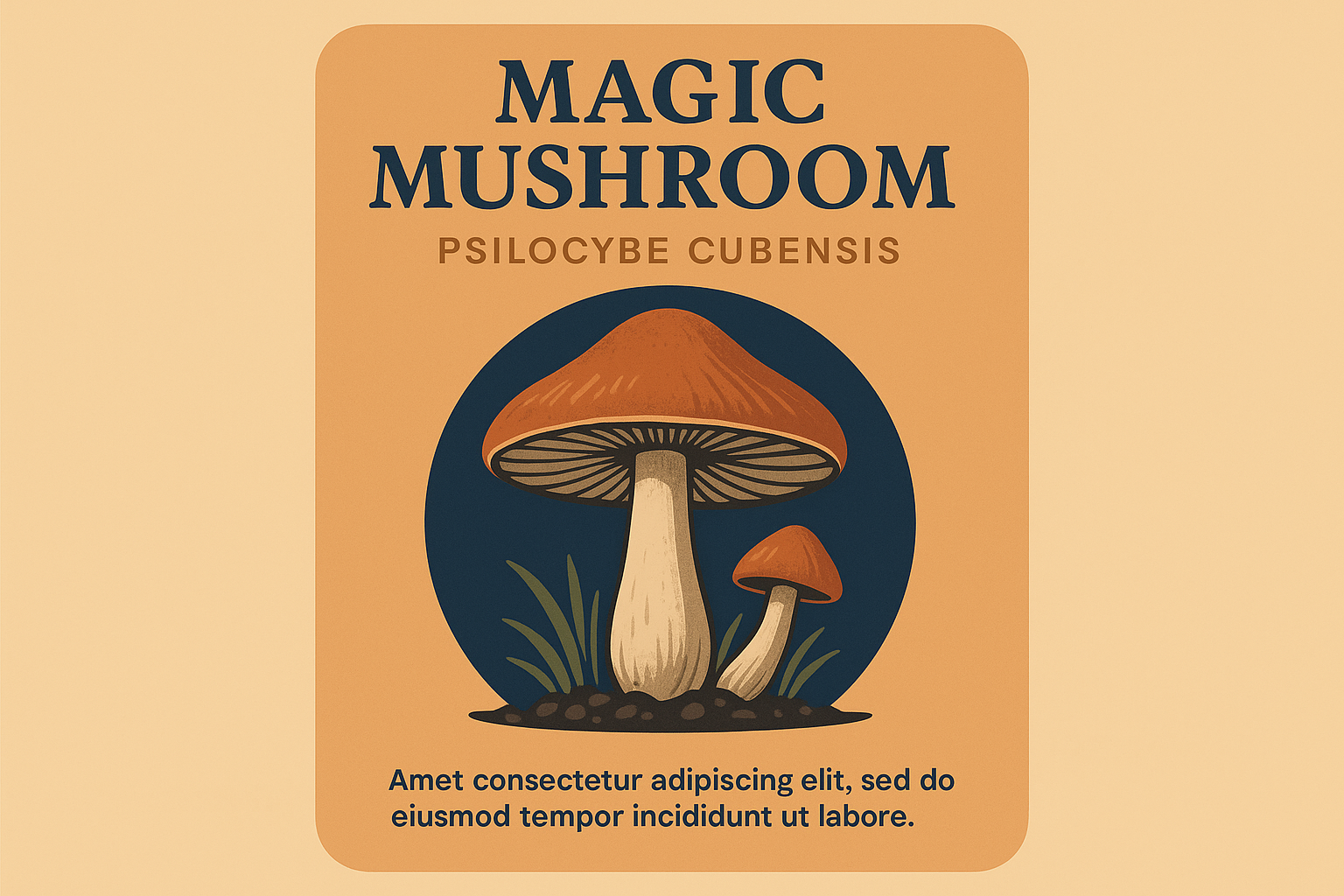 /Collection: /by davooda/Type: PNG/A vibrant illustration of magic mushrooms featuring a bold title and subtitle. The design incorporates a three-color scheme with a warm background and a clear hierarchy for readability.