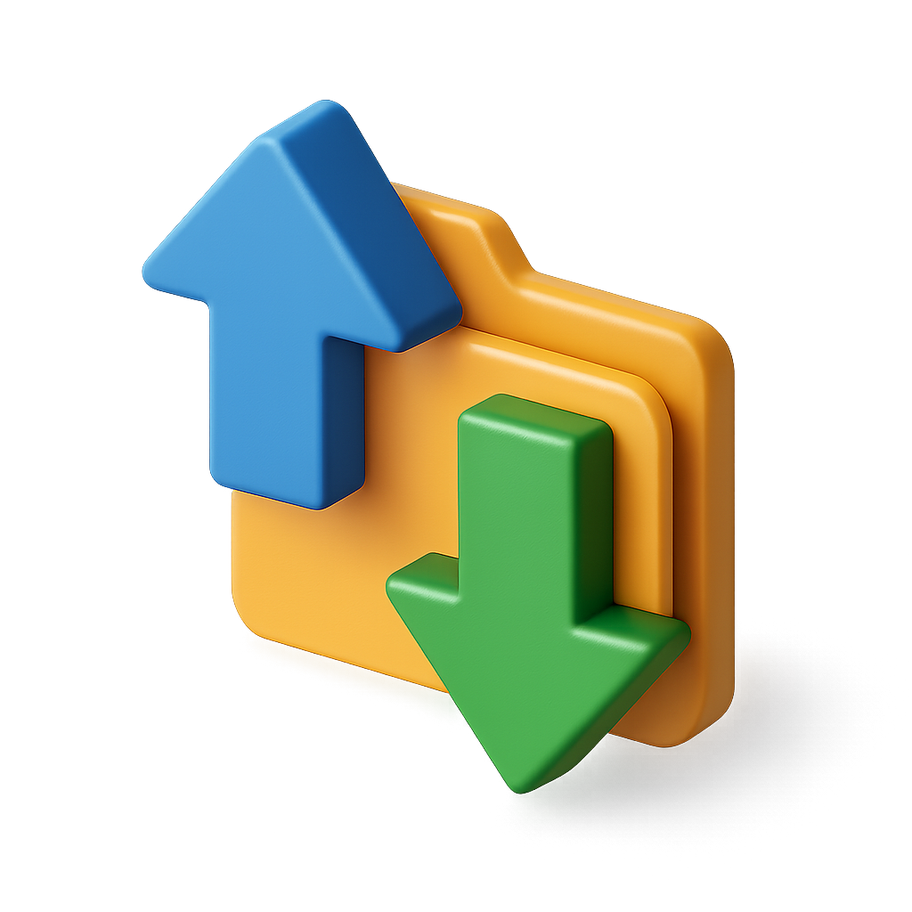 A vibrant 3D icon featuring upload and download arrows alongside a folder. The design is isometric with a transparent background, showcasing a modern and volumetric appearance.