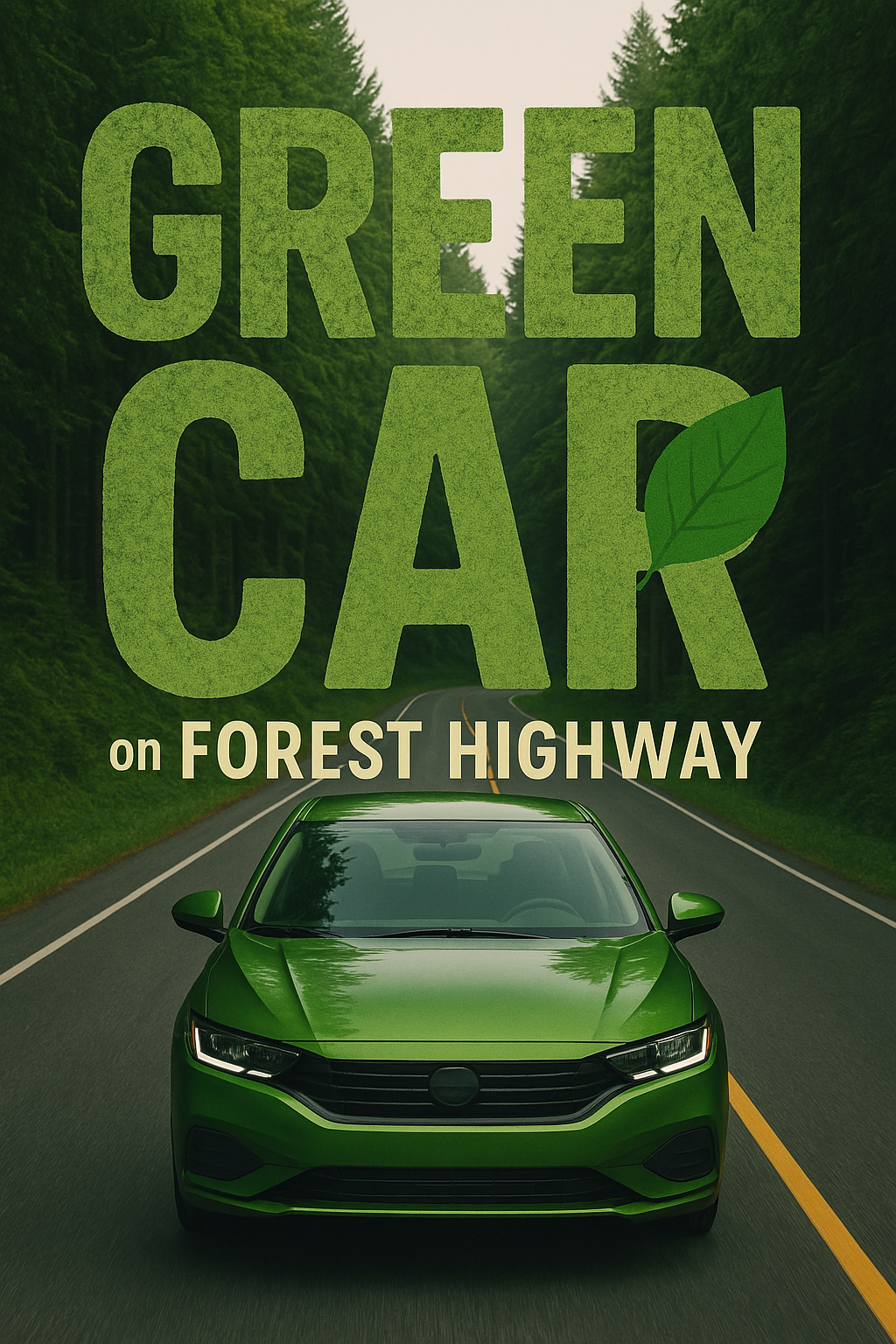 Promotional image showcasing a vibrant green car on a forested highway, emphasizing eco-friendliness and nature. Ideal for automotive marketing and environmental campaigns.