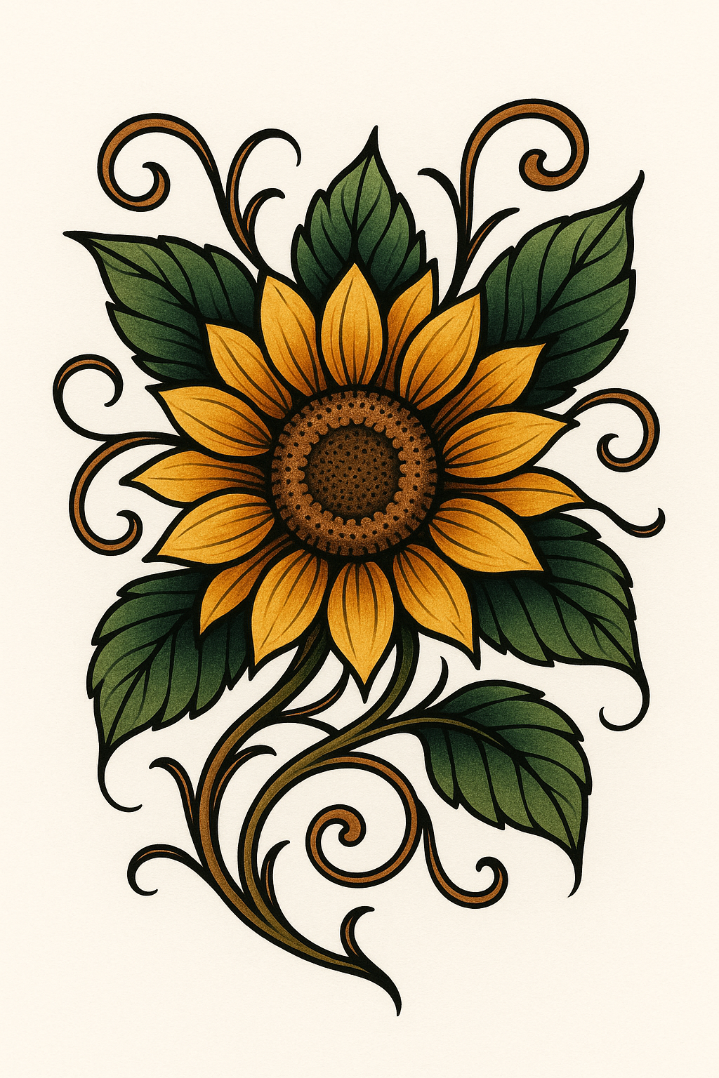 Elegant Floral Illustration of a Sunflower with Decorative Leaves