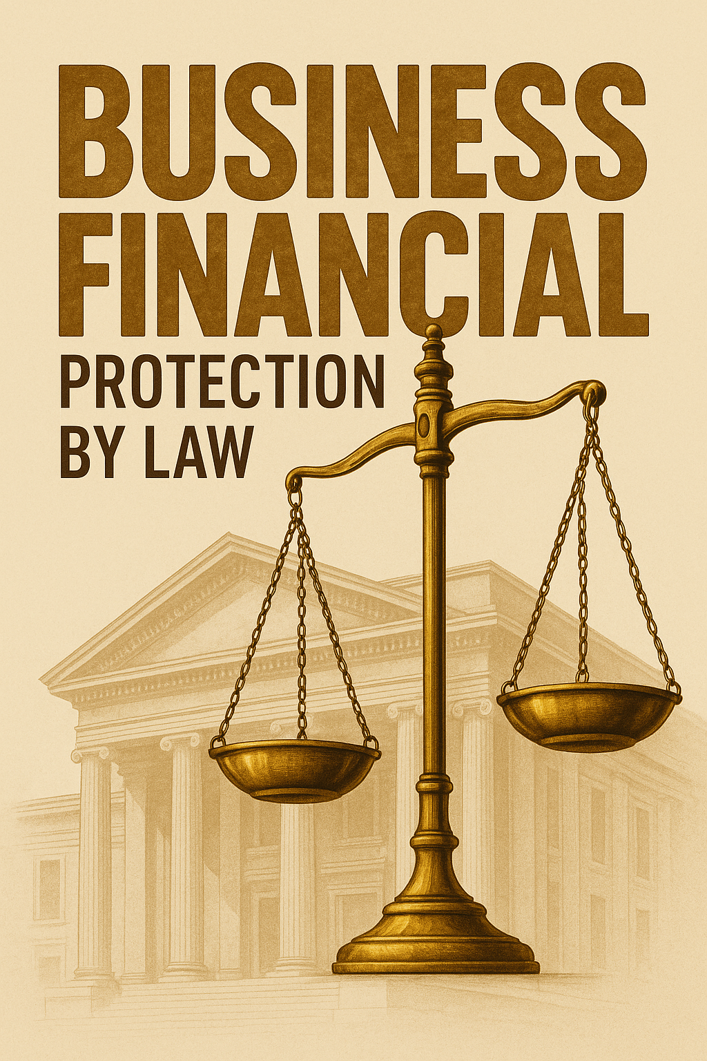 /Collection: , /by davooda/Type: PNG/An illustrative graphic depicting the concept of business financial protection under the law, featuring a scale of justice against a backdrop of a courthouse, ideal for legal and financial services marketing.