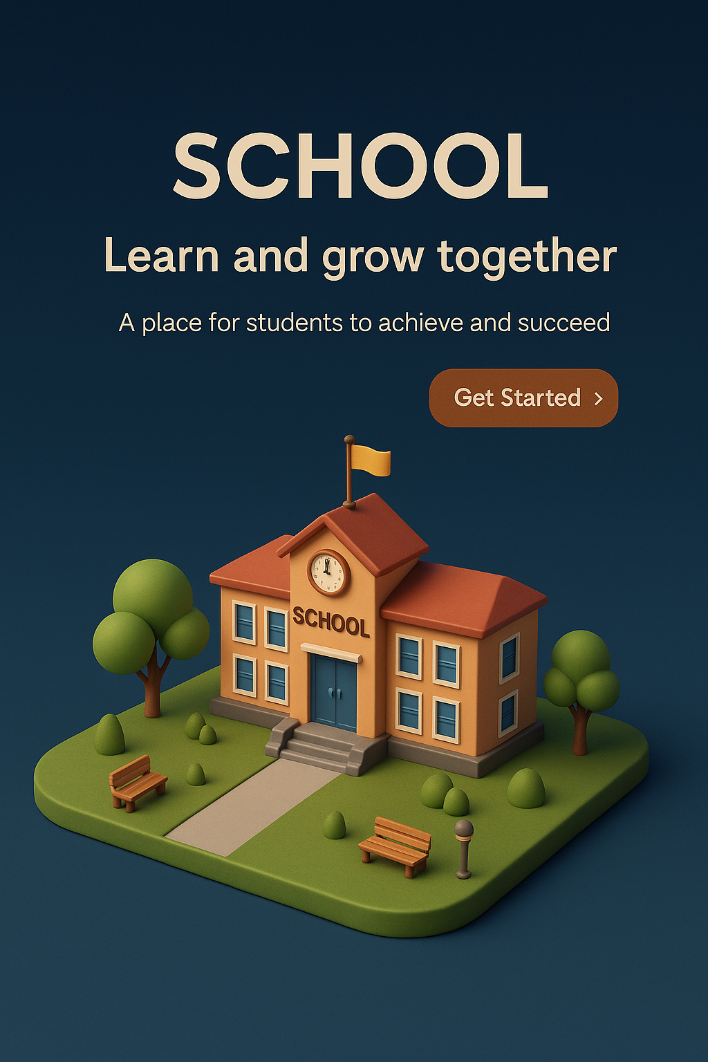 /Collection: /by davooda/Type: PNG/A visually appealing 3D representation of a school with a dark gradient background. The scene features a charming school building, trees, and benches, inviting students to learn.