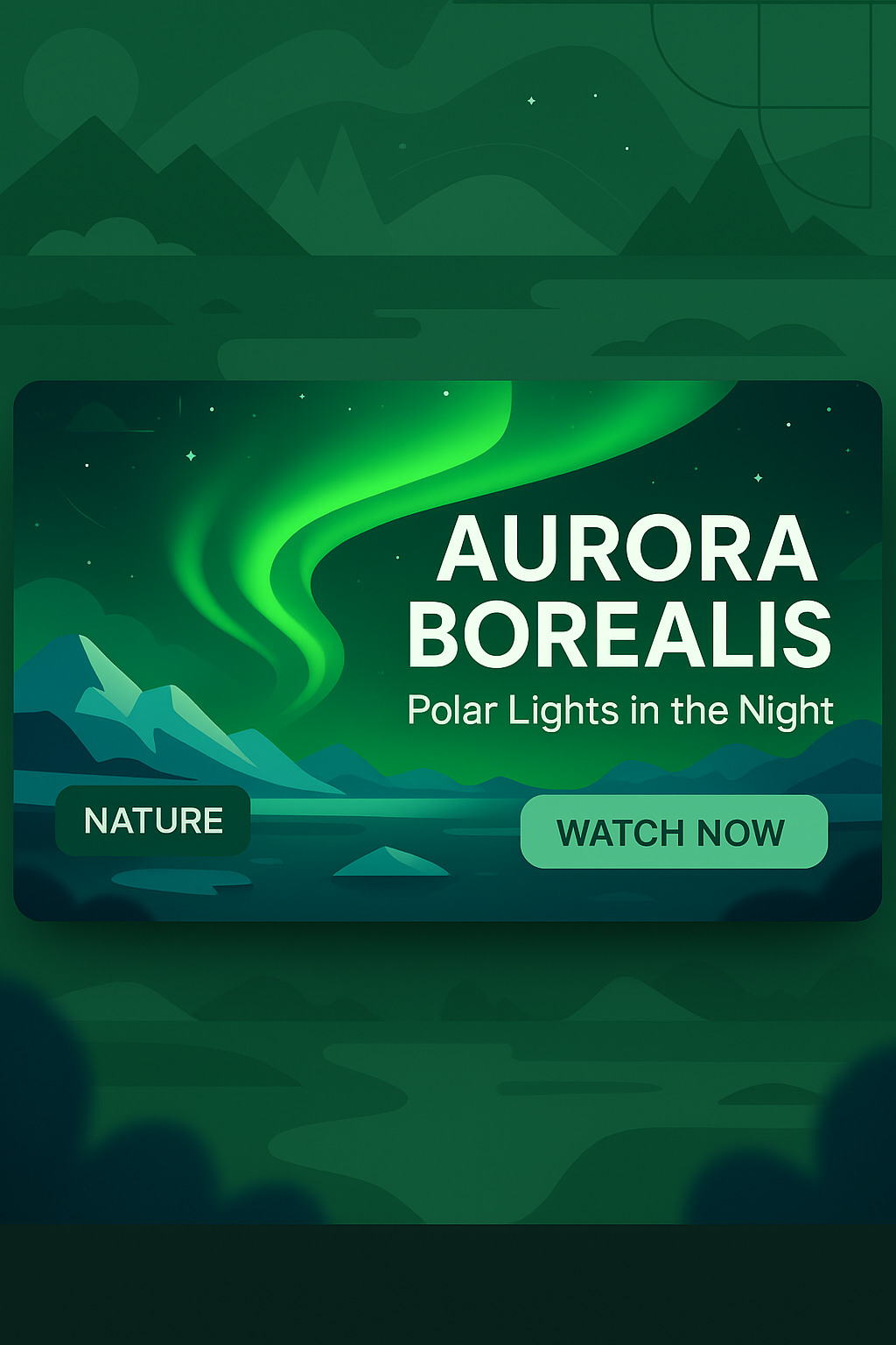 A visually striking graphic showcasing the Aurora Borealis over a serene landscape. Perfect for nature-themed content and educational purposes, with a modern, digital art style.