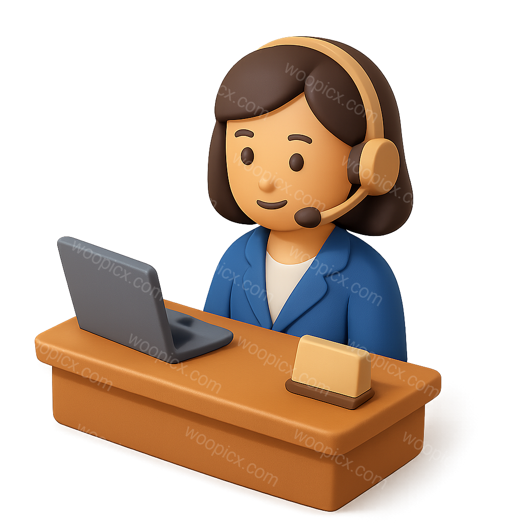 A 3D icon of a receptionist at a desk, featuring a character with a headset and a computer. The design is isometric with a volumetric feel, set against a soft gradient background.
