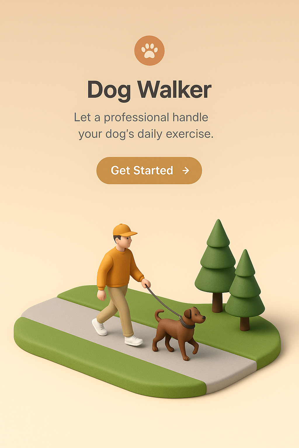 This 3D illustration depicts a dog walker strolling with a dog along a path, set against a smooth gradient background. The scene emphasizes realism and includes minimalistic trees and design elements.