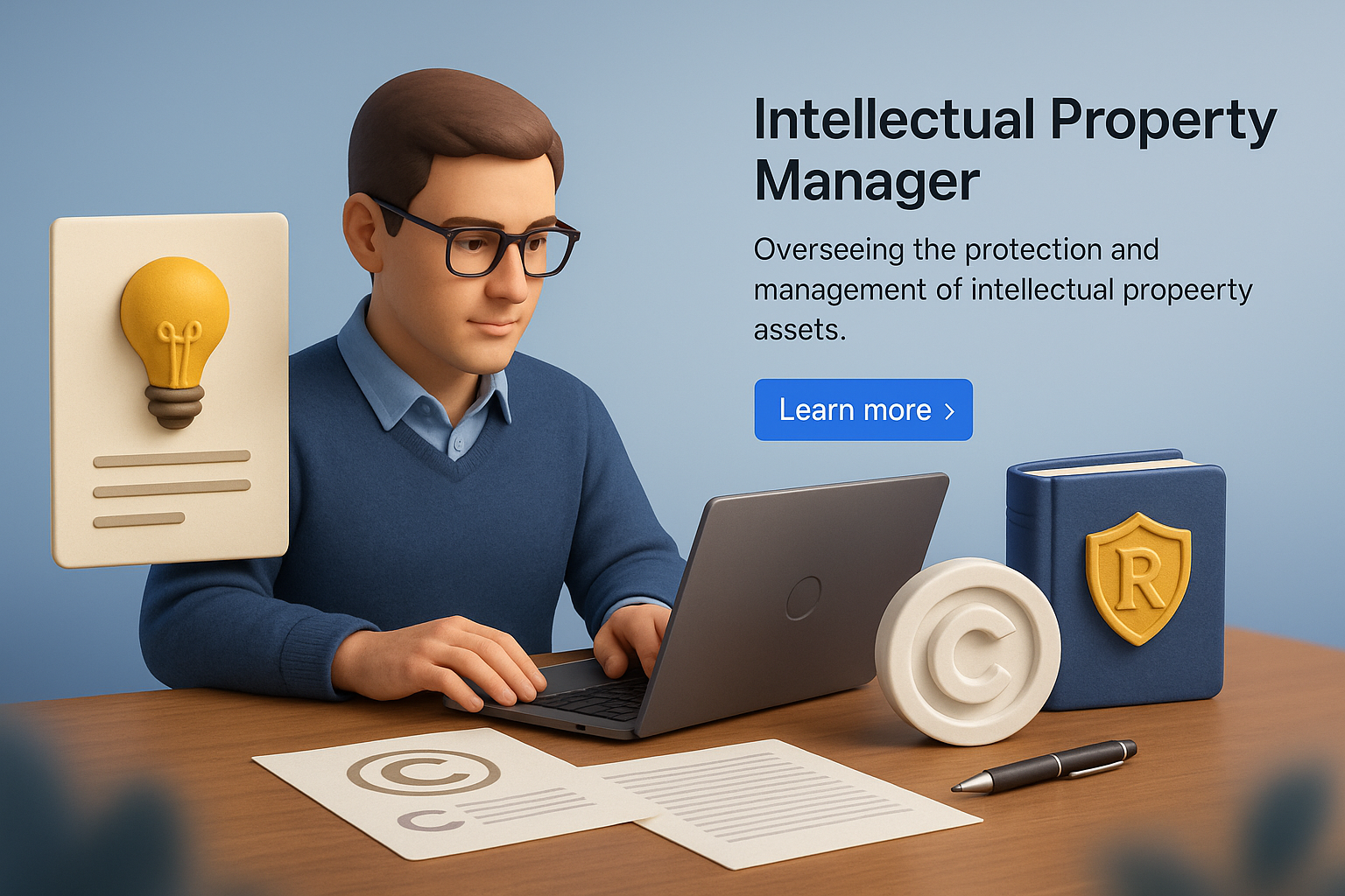 /Collection: /by davooda/Type: PNG/A realistic 3D illustration featuring an Intellectual Property Manager working on a laptop. Surrounding elements include icons and text blocks emphasizing the theme of intellectual property.