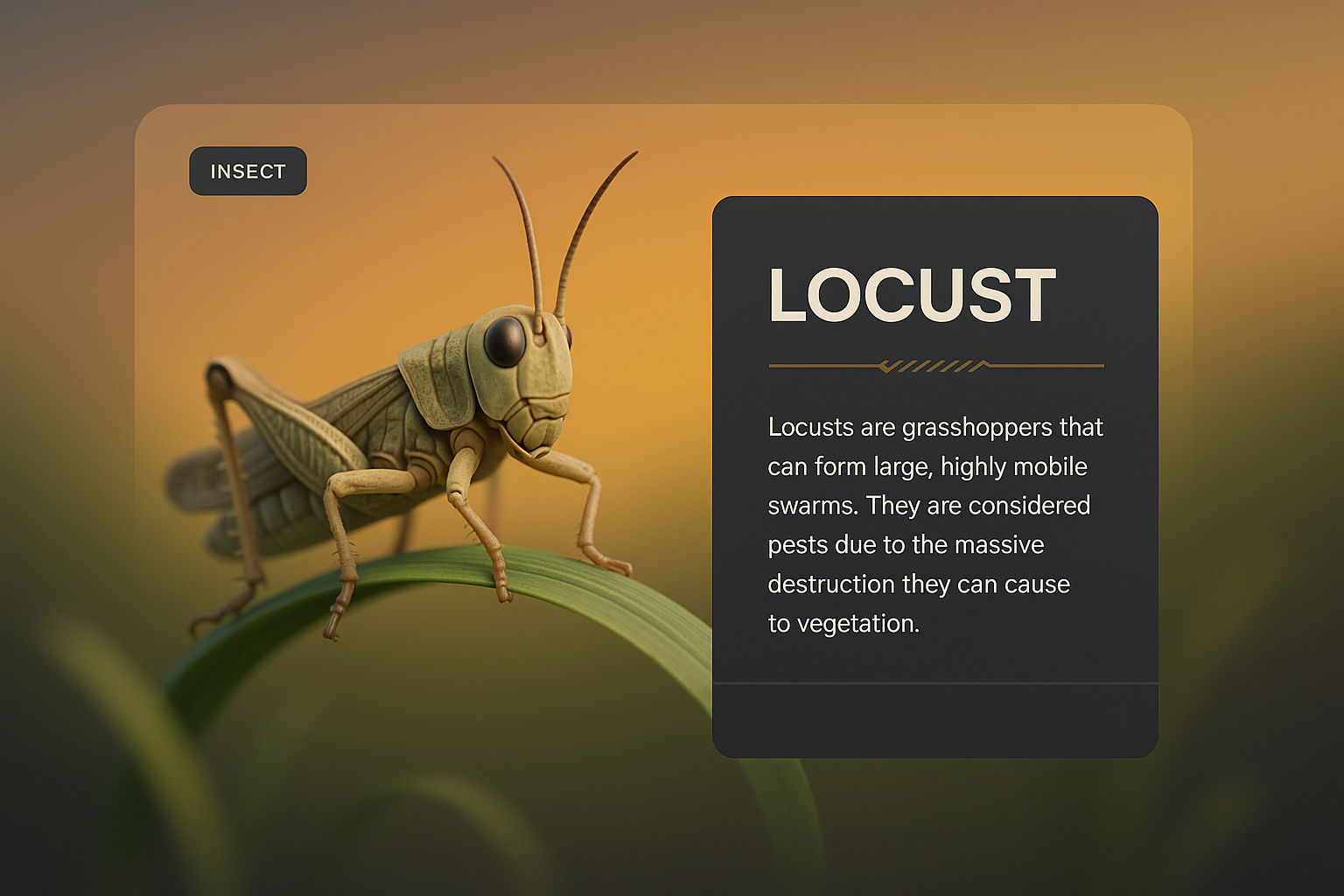 /Collection: /by davooda/Type: PNG/A detailed 3D illustration of a locust perched on a green blade of grass. The background features a smooth gradient transitioning to a solid color, enhancing the focus on the insect. Text blocks are creatively integrated into the design.