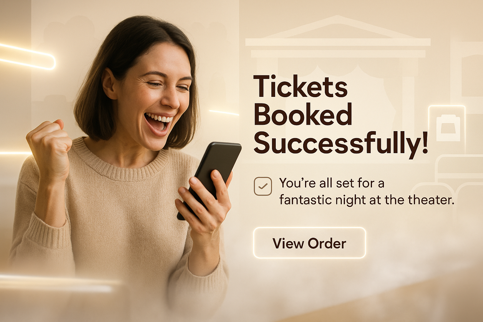 /Collection: /by davooda/Type: PNG/A promotional graphic celebrating successful theater ticket booking, featuring a joyful woman with a smartphone. The warm color palette and modern design make it suitable for app notifications or marketing materials.