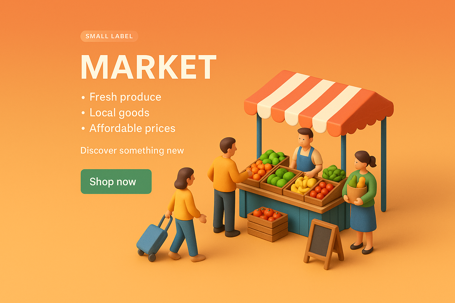 /Collection: /by davooda/Type: PNG/A vibrant 3D illustration of a miniature market scene, featuring small characters engaging with fresh produce at a colorful stall. The background has a smooth gradient, enhancing the overall realism.