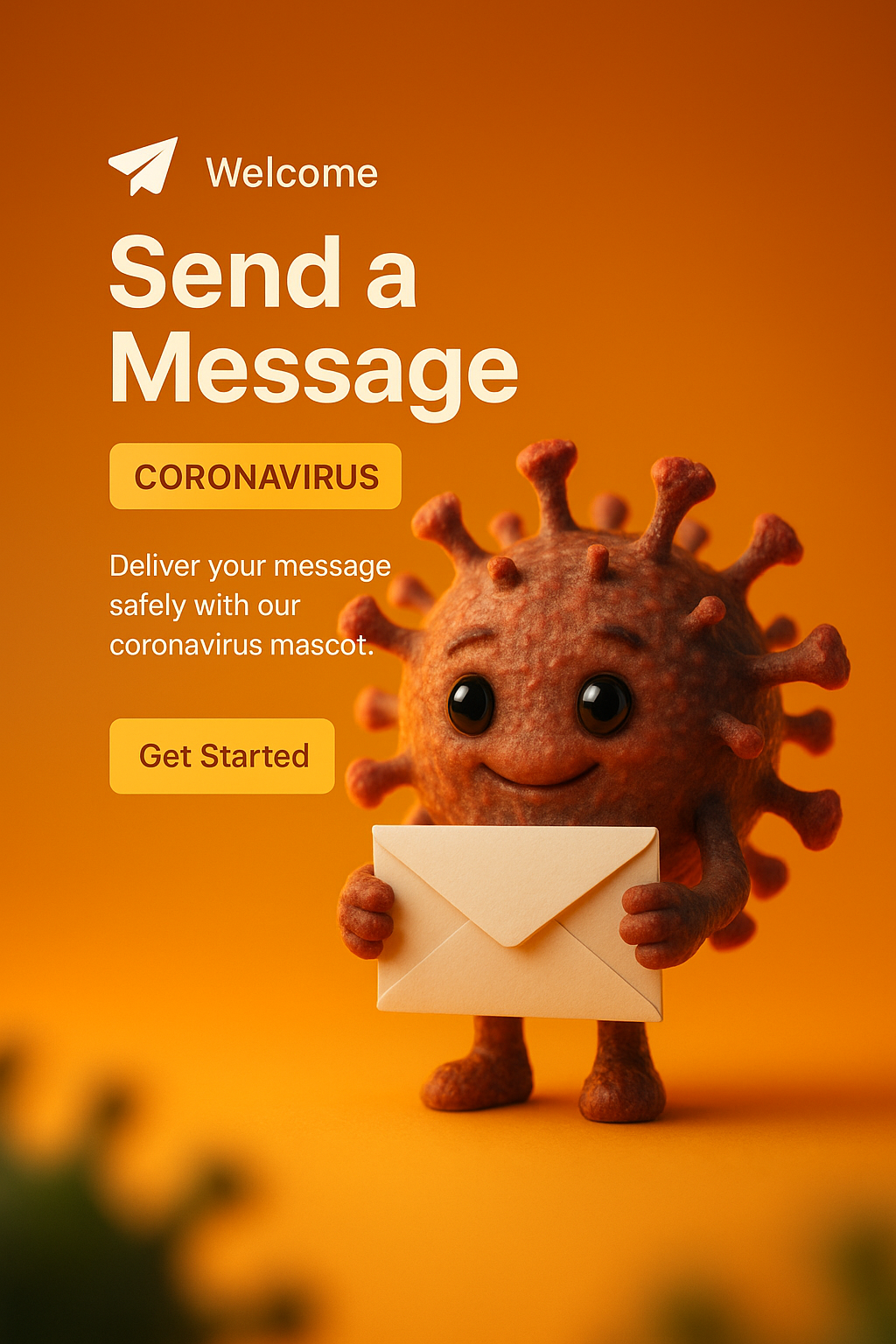 This image features a cute cartoon-style coronavirus mascot holding an envelope, set against a warm orange background. It's designed for a messaging app promoting safety.