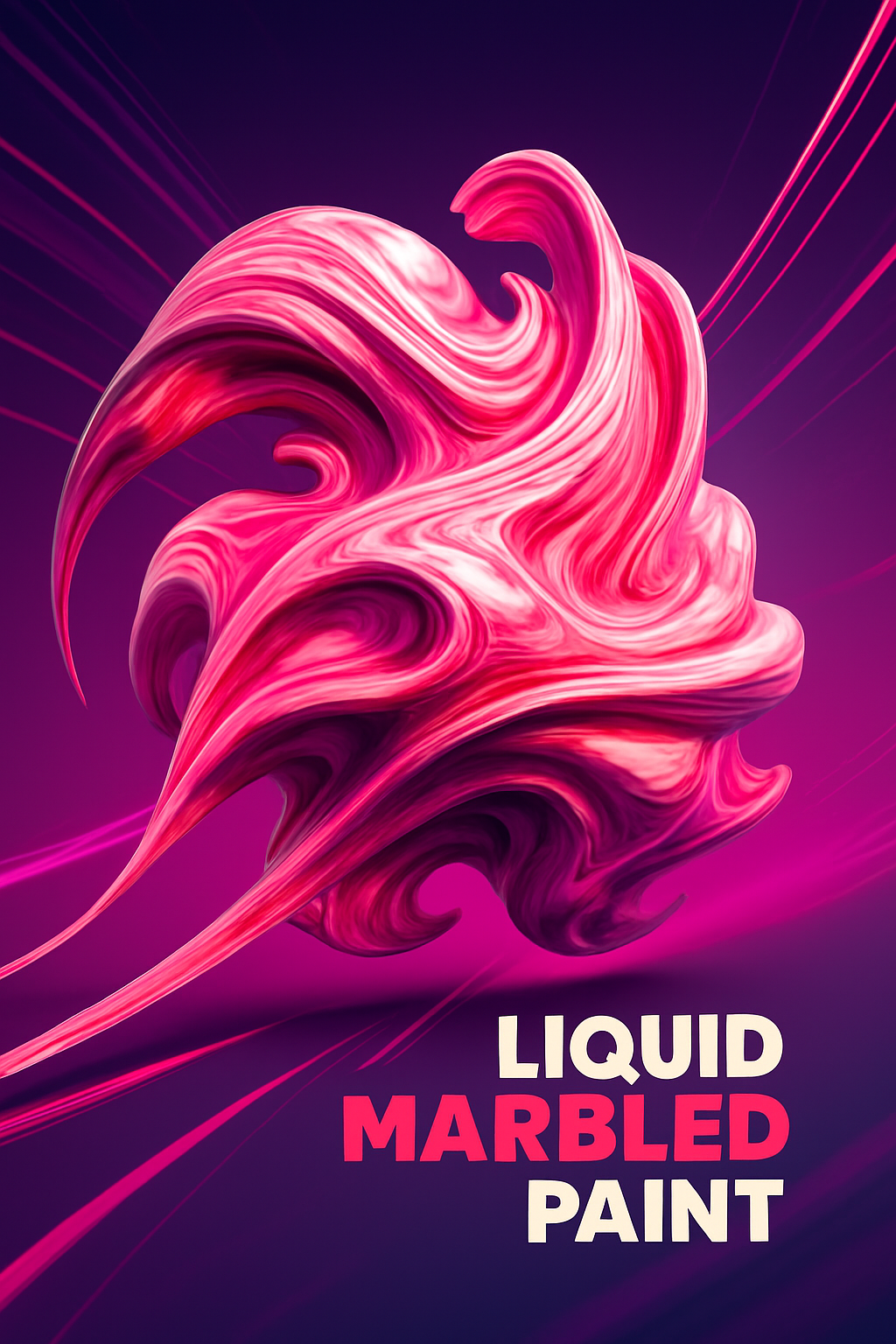 An eye-catching 3D illustration of pink marbled paint swirls, set against a gradient background. The dynamic design features flowing lines radiating from the center.