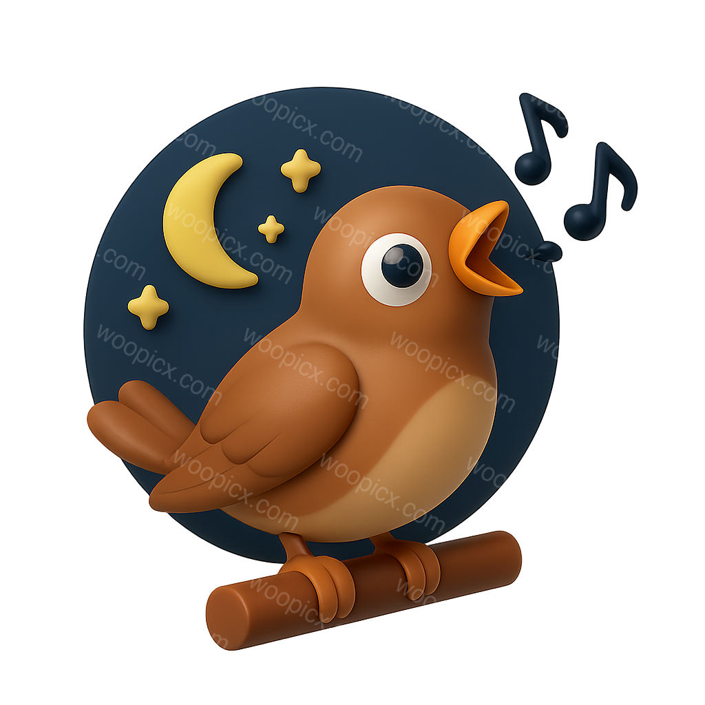 A whimsical 3D icon of a nightingale perched on a branch, singing under a night sky with stars and a crescent moon, featuring vibrant colors and a playful design.