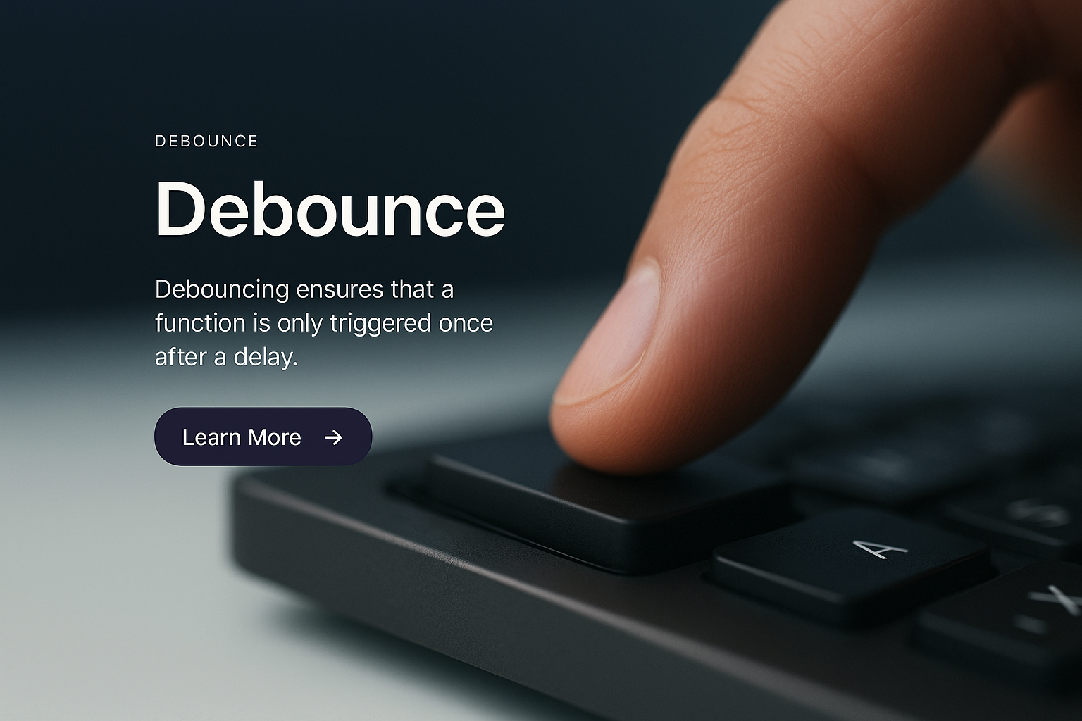 A stylish web page featuring a close-up of a finger pressing a keyboard key, emphasizing the concept of debounce. The design includes minimalistic text elements and a clear call-to-action.