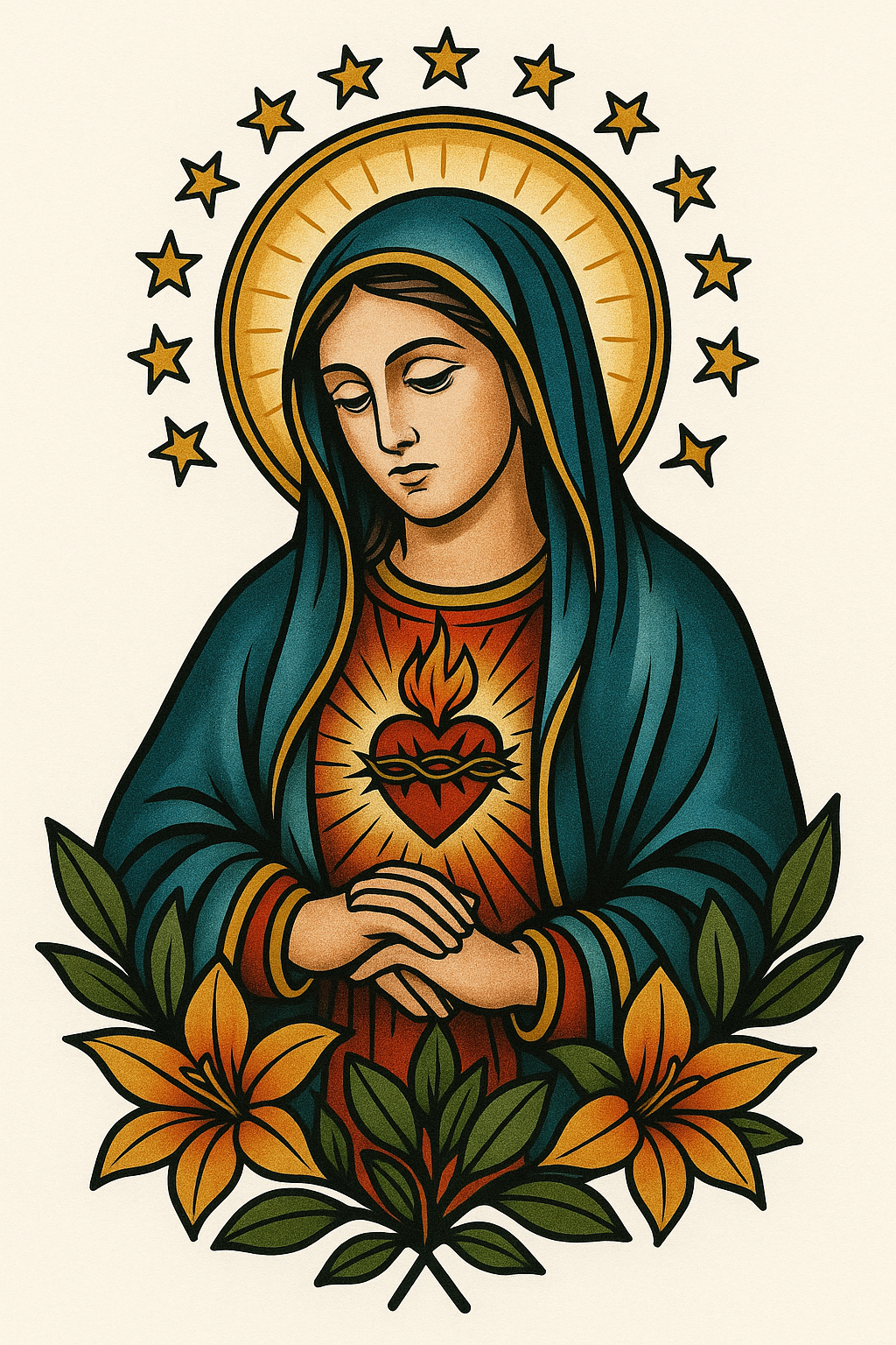 /Collection: /by davooda/Type: PNG/Vibrant and detailed illustration of a religious figure surrounded by floral elements, showcasing a blend of traditional and modern artistic styles. Ideal for spiritual or decorative uses.
