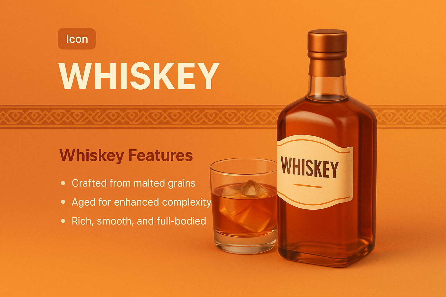 A visually appealing whiskey landing page featuring a 3D bottle and glass. It includes highlighted features about whiskey, with a smooth gradient background and decorative patterns.