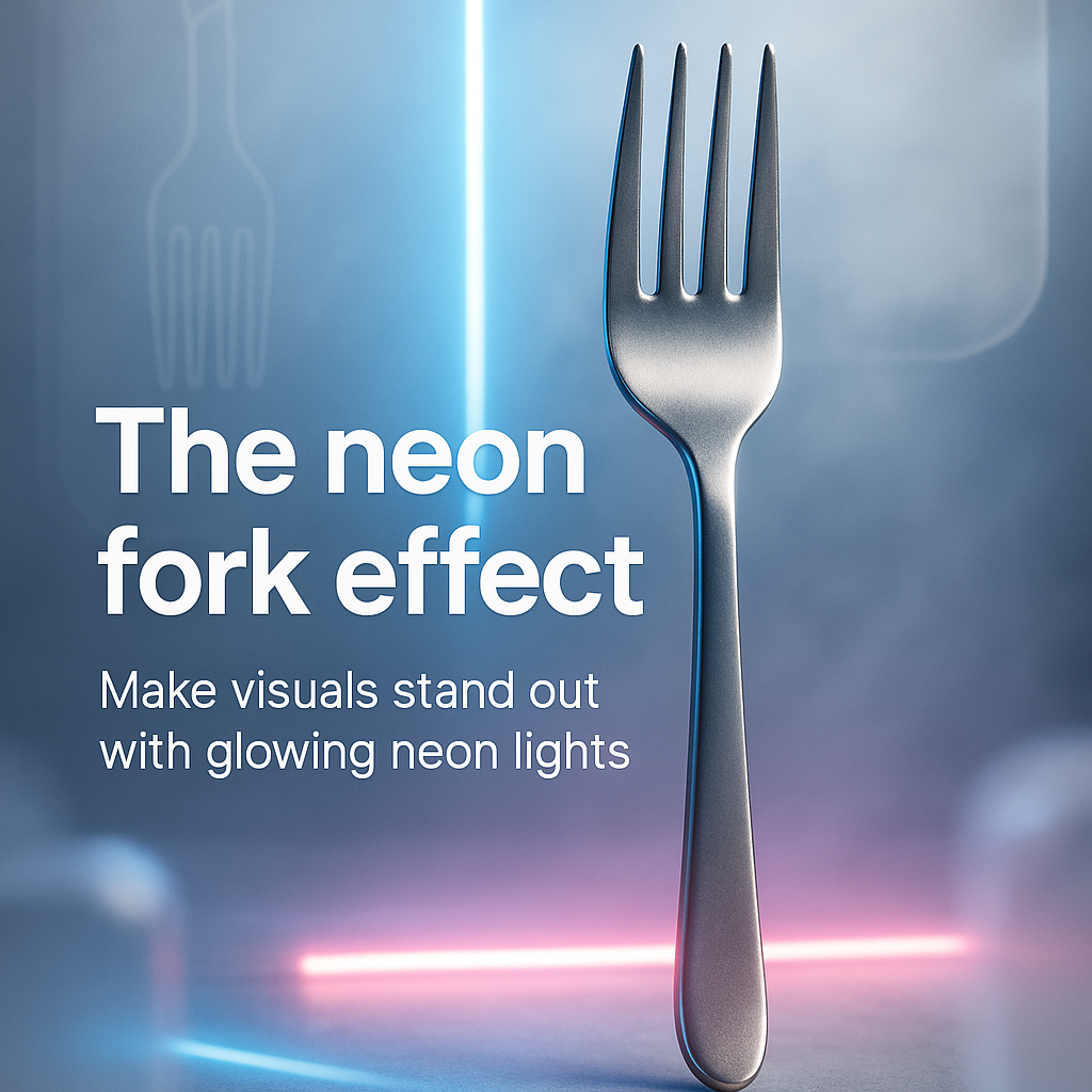 A visually striking graphic showcasing a metallic fork illuminated by vibrant neon lights, ideal for culinary or design-themed marketing materials.