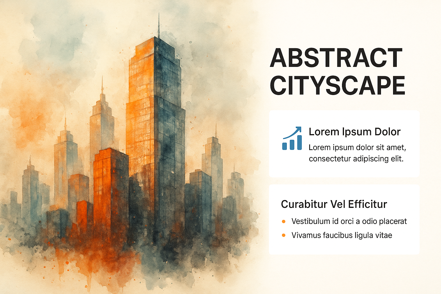 Artistic illustration of an urban skyline in a watercolor style, suitable for creative projects or marketing materials. The design features a blend of warm colors and abstract shapes.