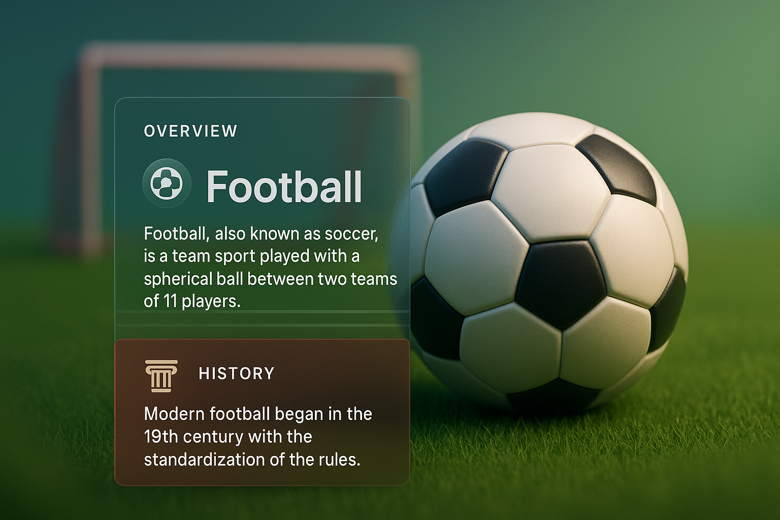 A visually appealing web design concept featuring a 3D soccer ball and layered information blocks. The design includes gradient backgrounds and text overlays that enhance readability.