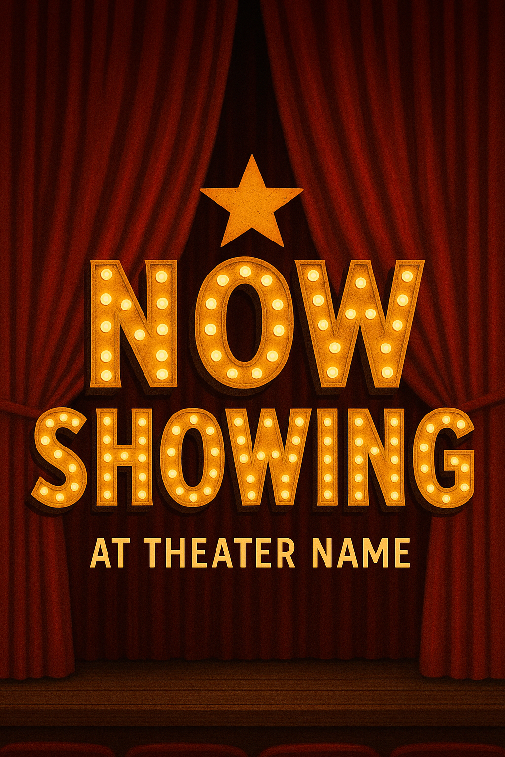 A vibrant theater announcement graphic featuring retro-style marquee lights. Ideal for promoting film showings with a dramatic curtain backdrop.