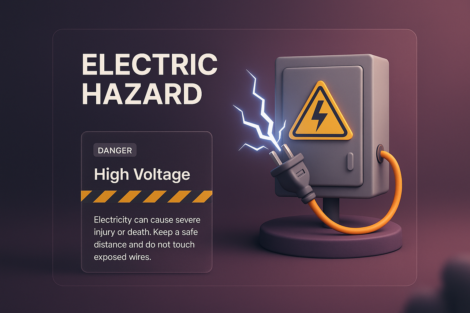 /Collection: /by davooda/Type: PNG/A visually striking 3D illustration depicting an electric hazard with a high voltage warning sign. The image features a gradient background, a power plug with sparks, and informative text.