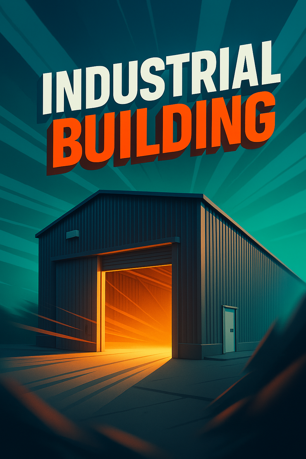 /Collection: /by davooda/Type: PNG/A vibrant illustration of a large industrial building with an open door, featuring dynamic lines radiating from the center. The color palette avoids yellow, ensuring a professional aesthetic.