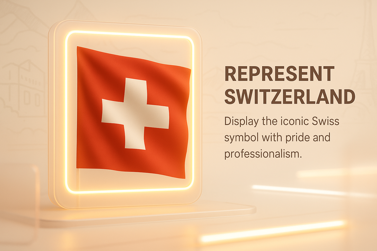 A modern 3D graphic showcasing the Swiss flag, illuminated with soft lighting. Ideal for patriotic themes or promotional materials related to Switzerland.