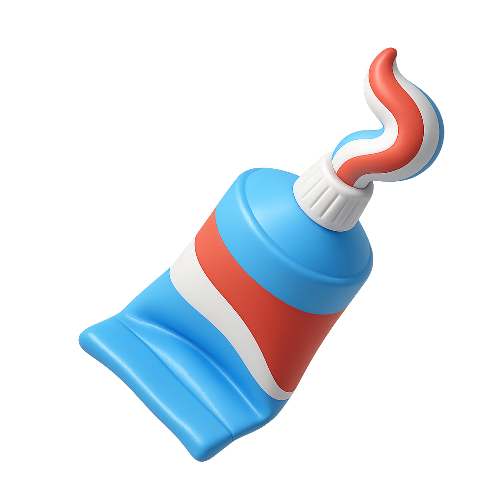 A colorful 3D illustration of a squeezed toothpaste tube, featuring a blue and red design with a whimsical swirl at the top, set against a transparent background.