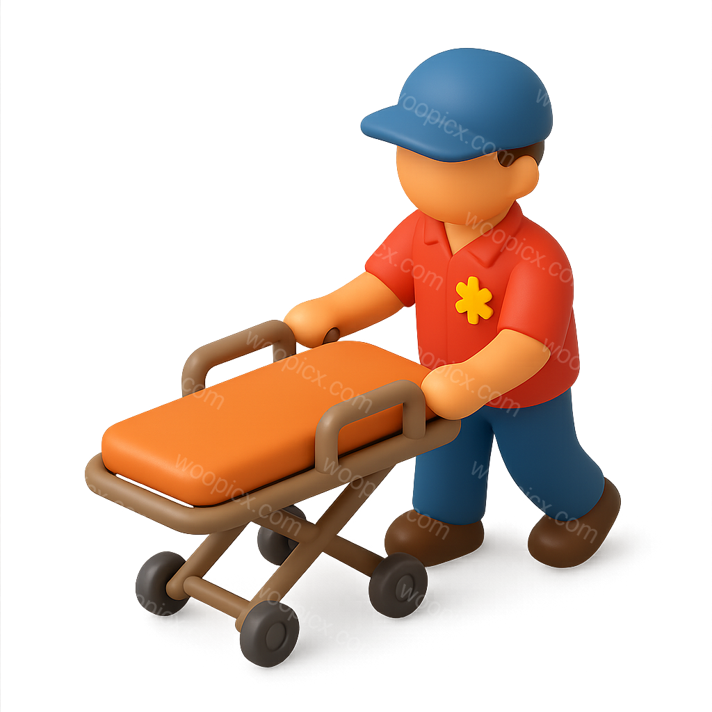 /Premium/Collection: /by davooda/Type: PNG/A vibrant 3D paramedic icon depicted in an isometric style, pushing a stretcher with an orange surface. The figure is wearing a blue cap and a red shirt, creating a dynamic, friendly appearance.