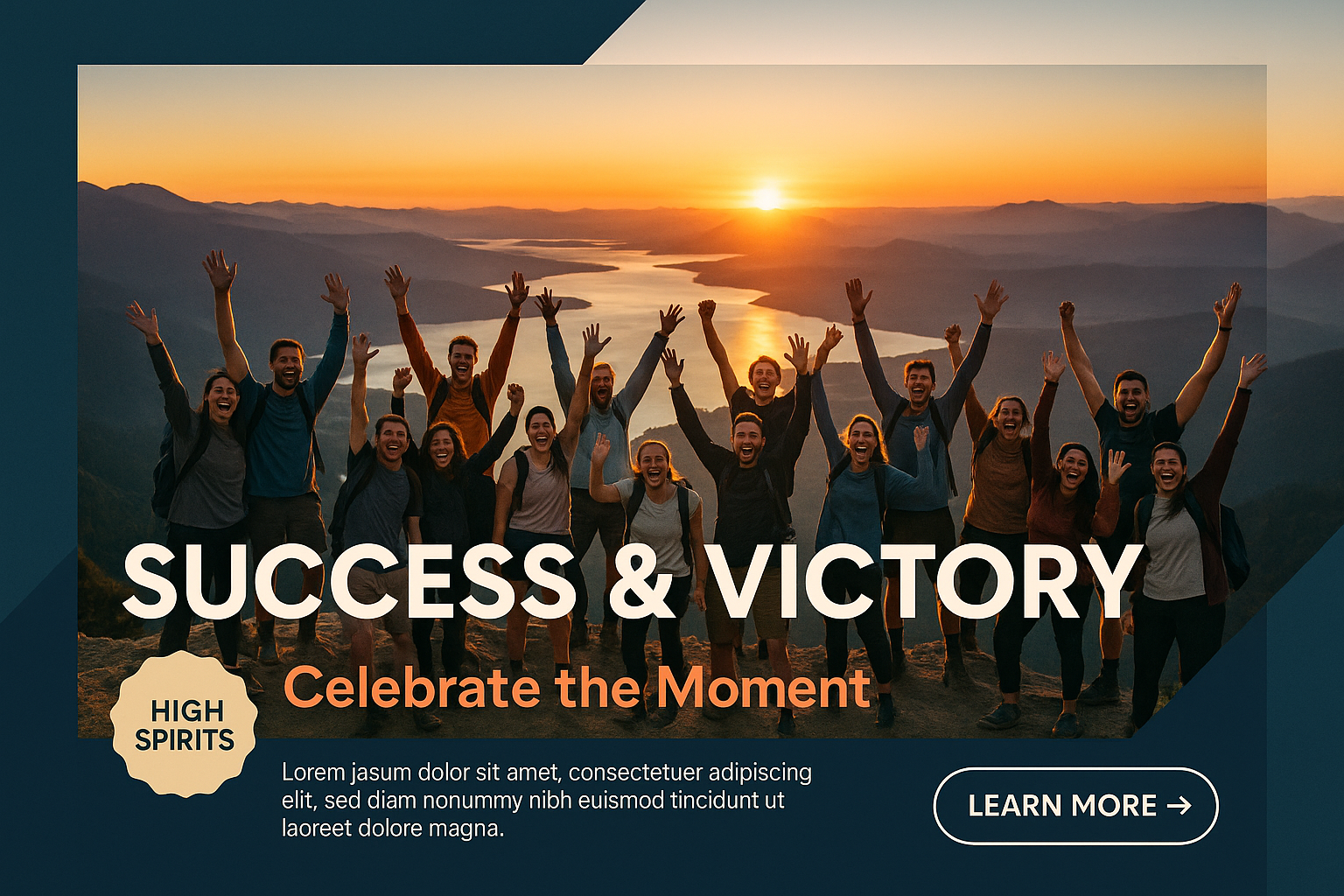 /Collection: /by davooda/Type: PNG/A large group of people stands triumphantly on a mountain peak at sunset, arms raised in joy and celebration. The stunning backdrop features lakes and distant mountains, creating a vibrant atmosphere of success.