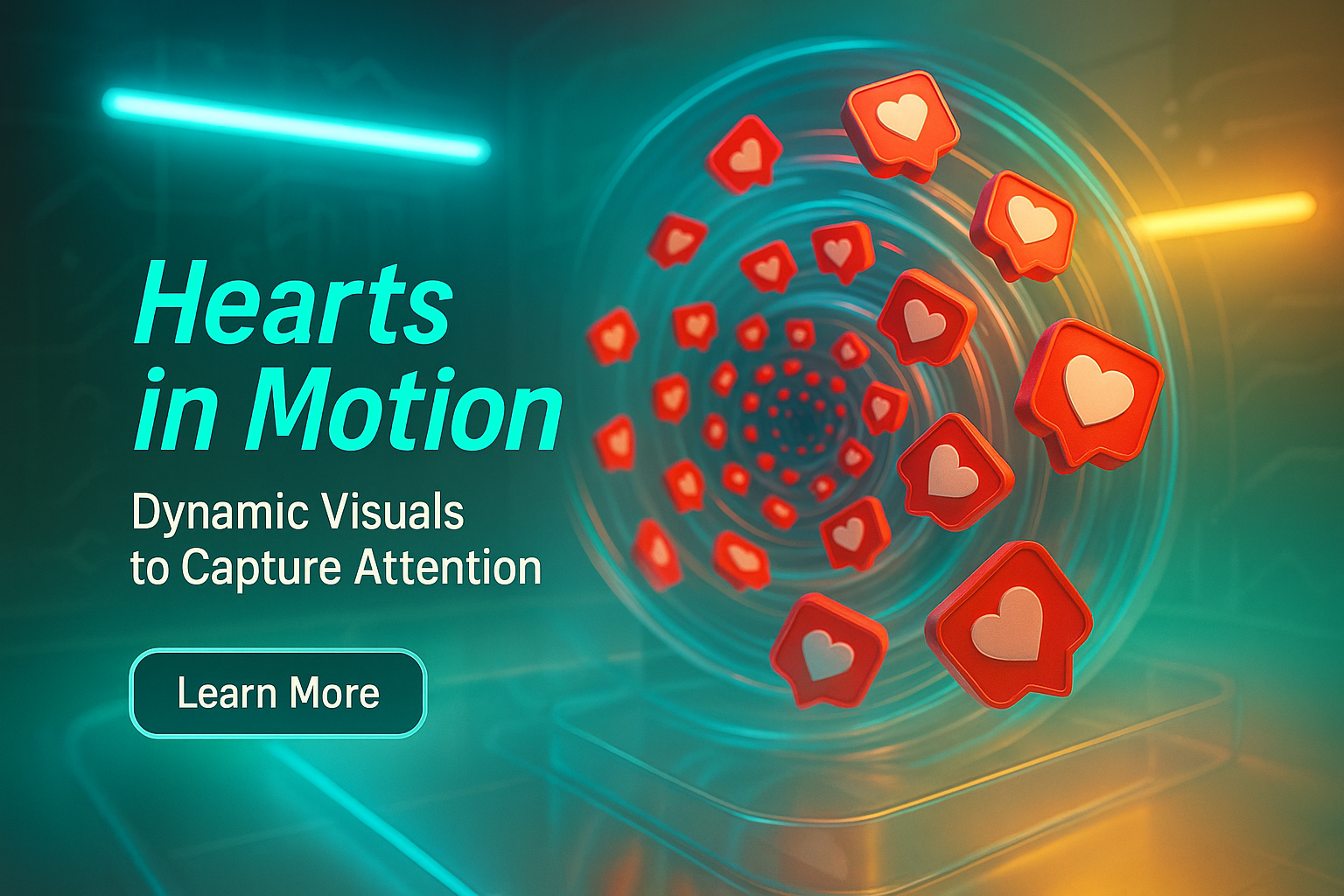 Vibrant 3D graphic showcasing animated hearts in motion, ideal for digital marketing and social media campaigns focused on engagement and attention capture.