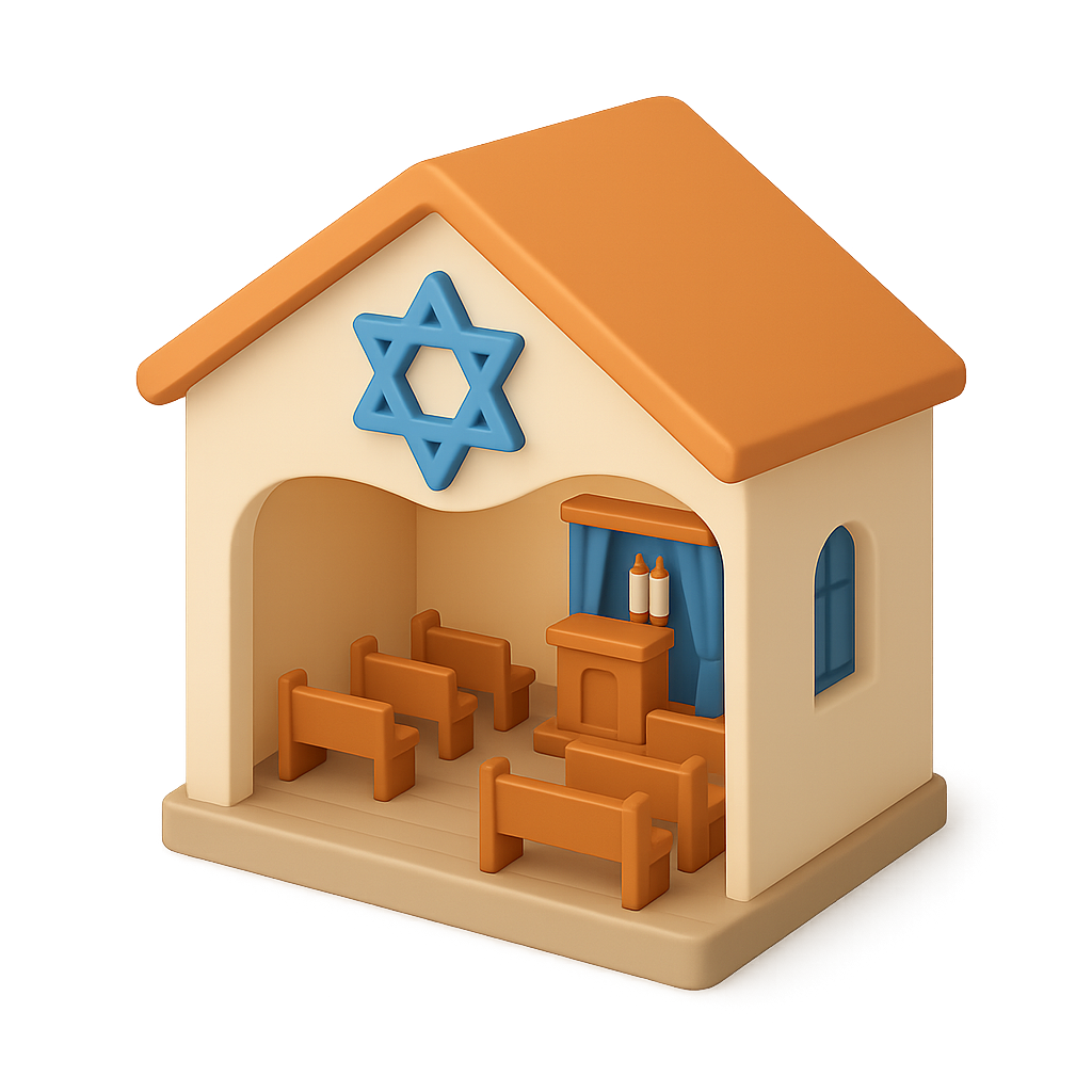 /Collection: /by davooda/Type: PNG/A 3D representation of a synagogue prayer hall, featuring an orange roof and blue Star of David. The interior includes benches and a central altar, all set in an isometric view.