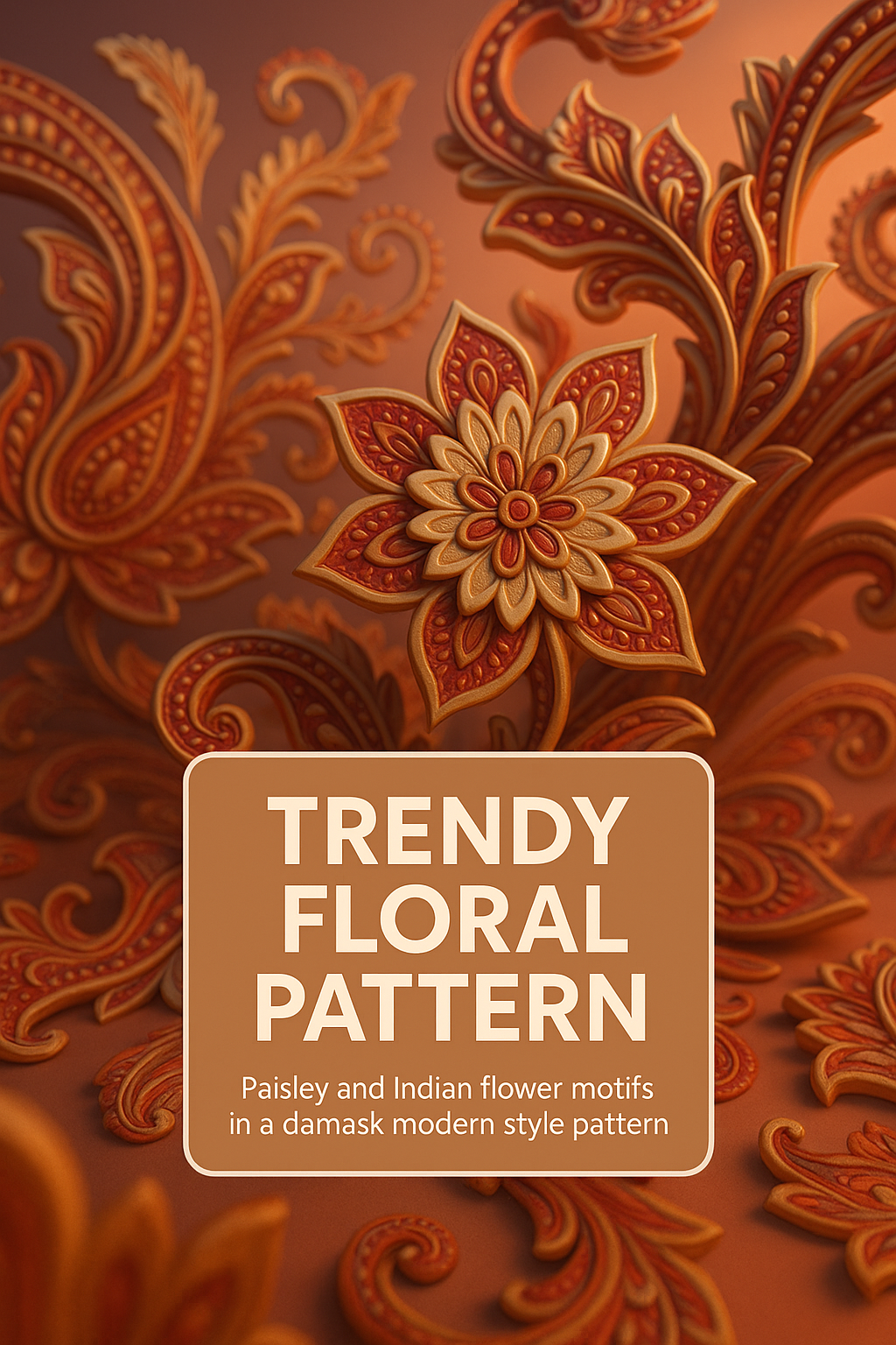 This image features a trendy floral pattern combining paisley and Indian flower motifs in a modern damask style. Ideal for design projects and textiles.