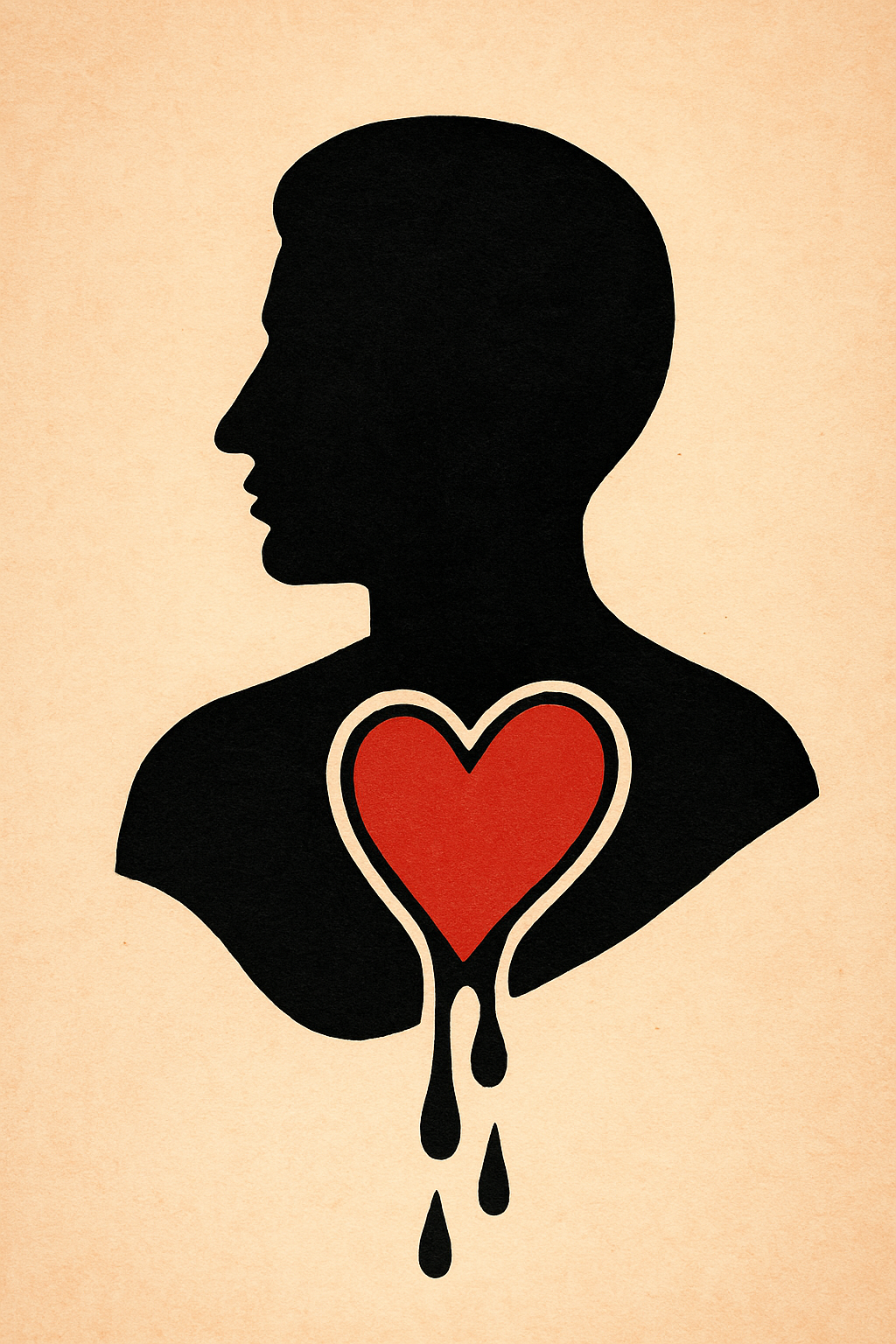 /Collection: /by davooda/Type: PNG/The image features a striking silhouette of a person with a heart that drips black liquid. The tattoo design uses a classic style with vibrant colors against a light beige background.