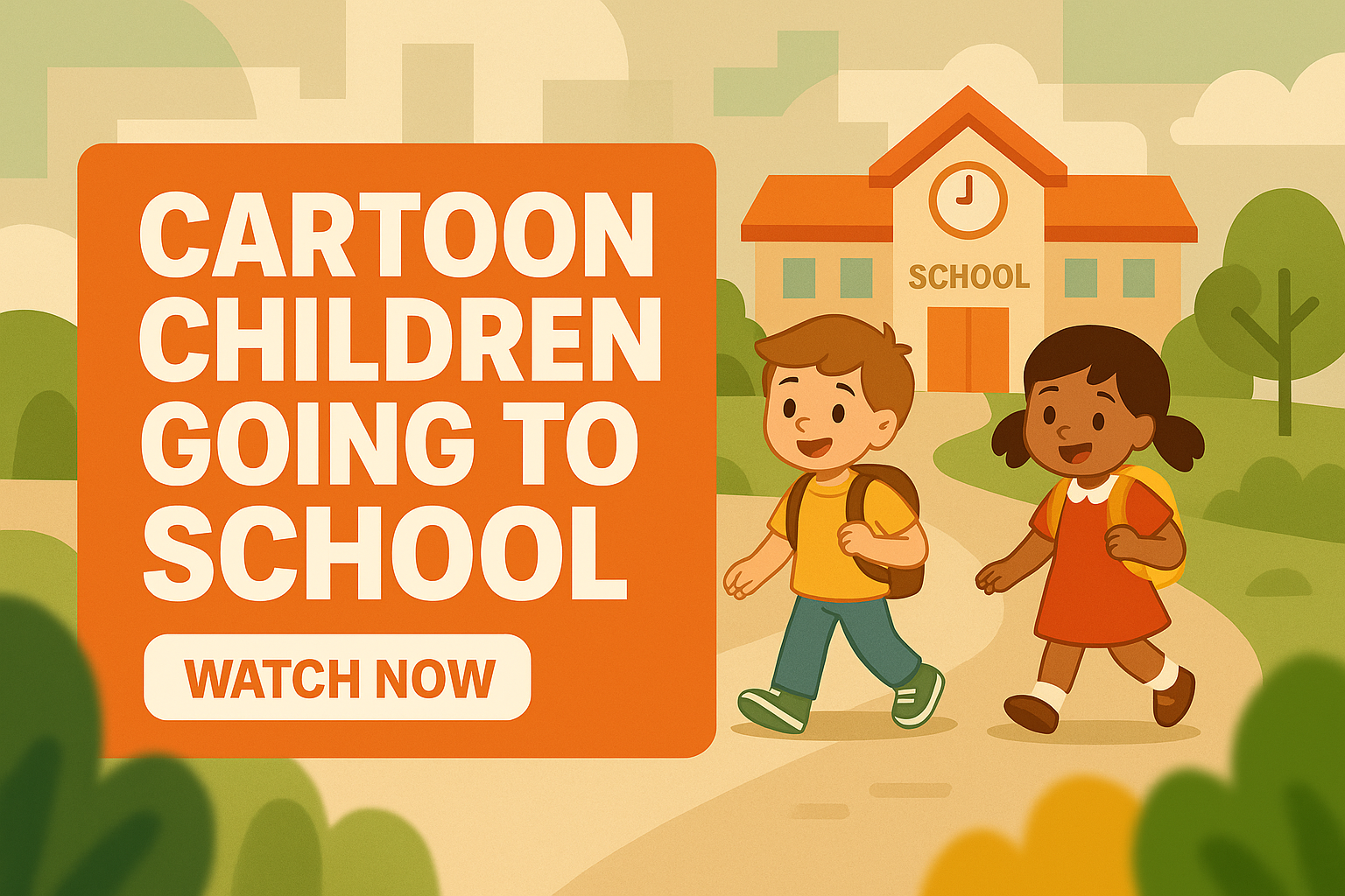 /Collection: /by davooda/Type: PNG/Vibrant cartoon illustration depicting children on their way to school, featuring cheerful colors and a friendly atmosphere, ideal for educational content or children's media.