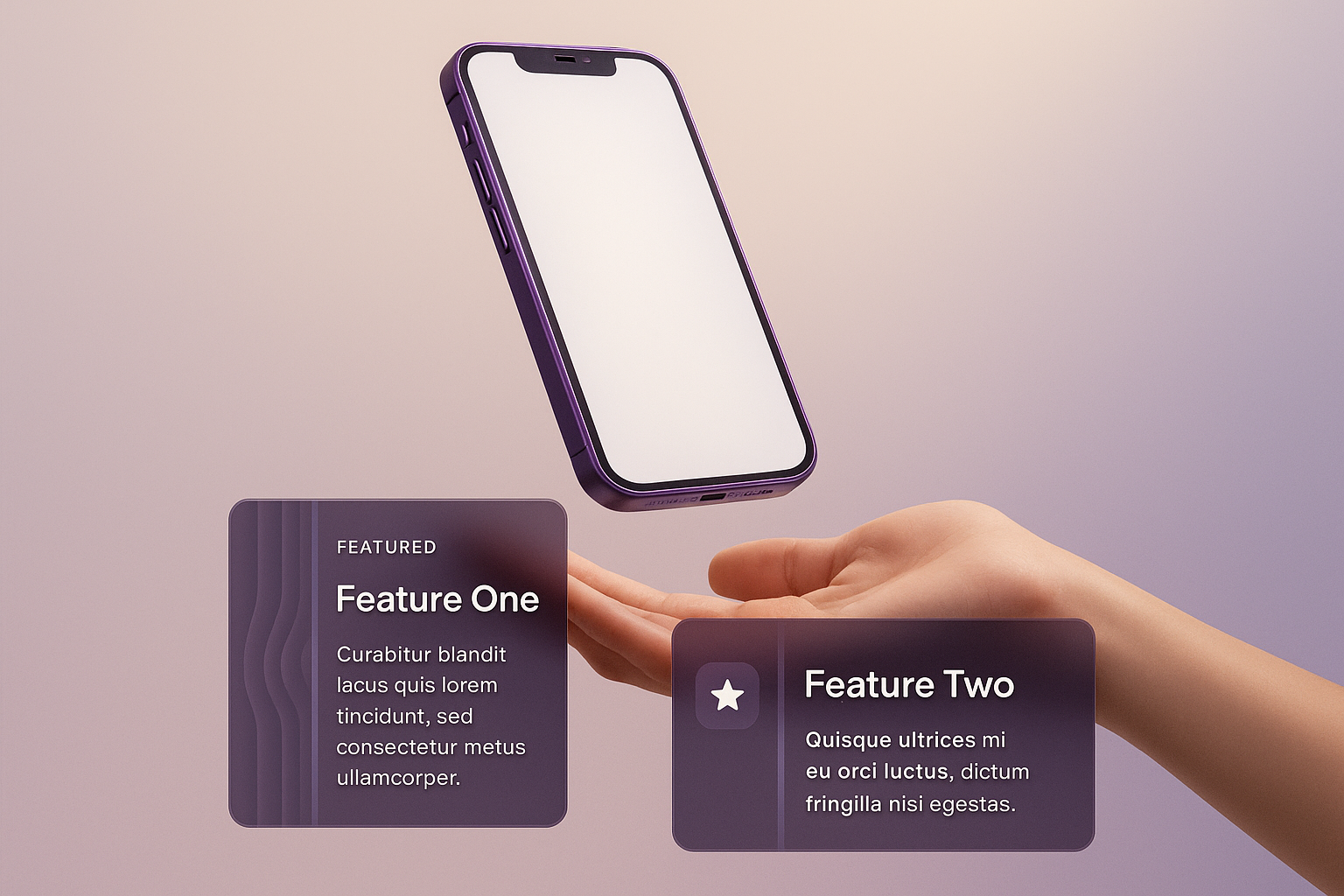 A sleek purple phone hovers gracefully above a hand, set against a soft gradient background. The design features stylish informational blocks with vibrant colors, enhancing the modern aesthetic.