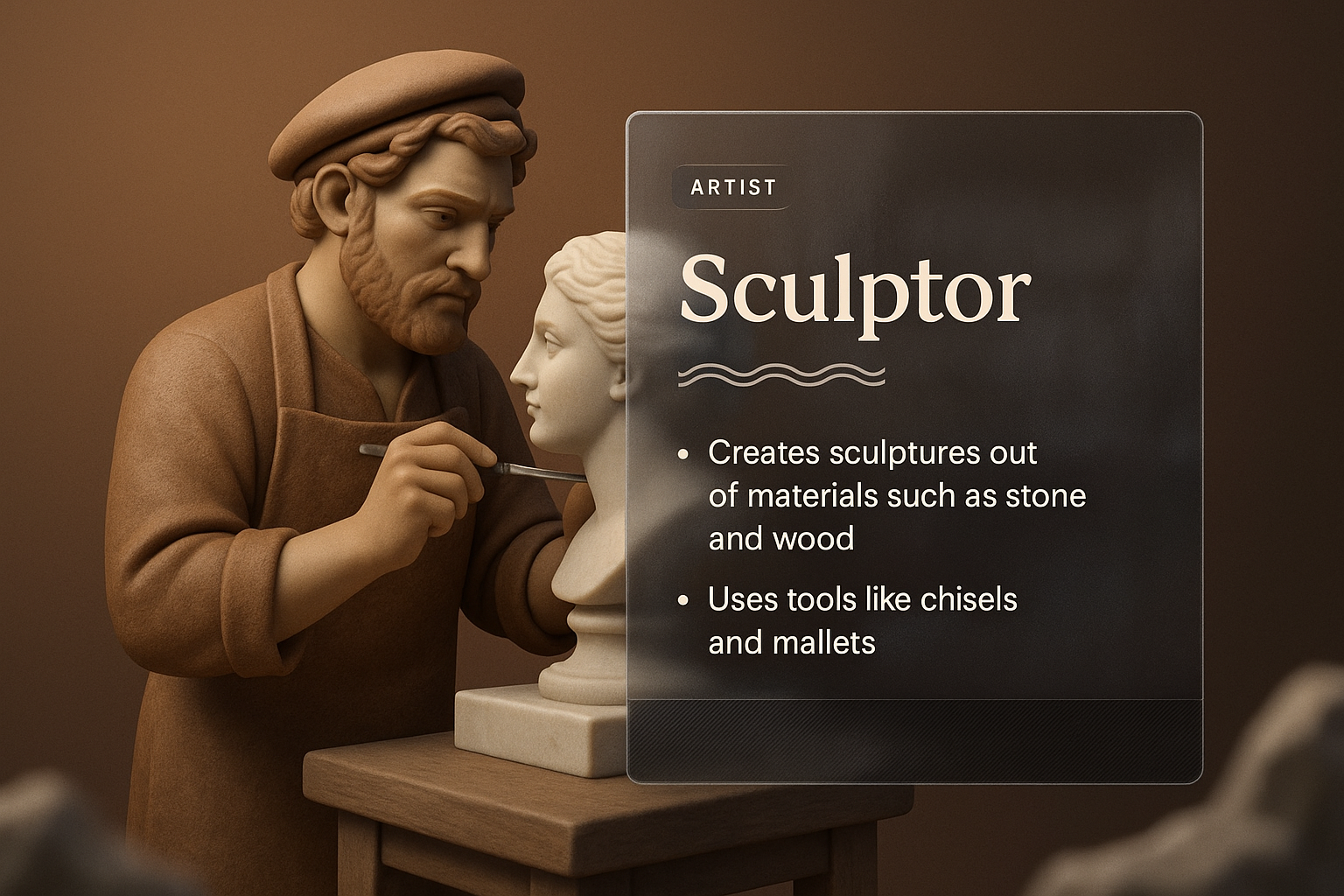 A captivating 3D design showcasing a sculptor meticulously working on a statue. The scene integrates a dark overlay with text highlighting the artist and their craft, enhancing visual depth.