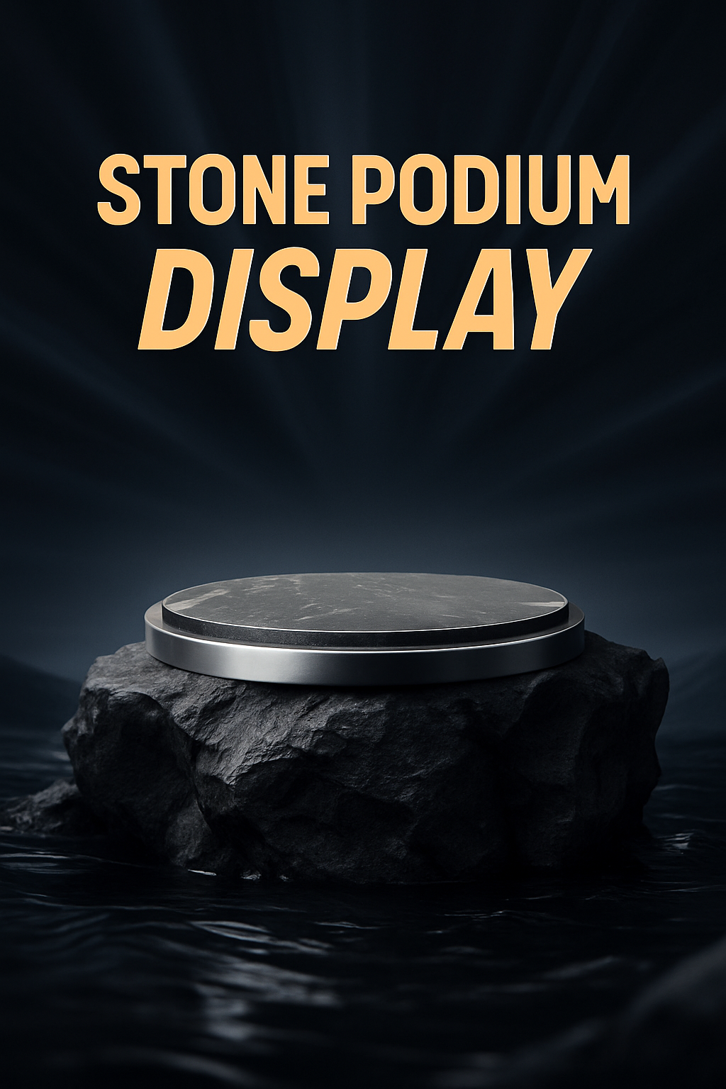 /Collection: /by davooda/Type: PNG/This image features a sleek stone podium set against a dark, abstract nature scene. The podium, with a round rim and silver accents, is surrounded by dark water and dynamic light rays, creating an engaging backdrop for product presentation.