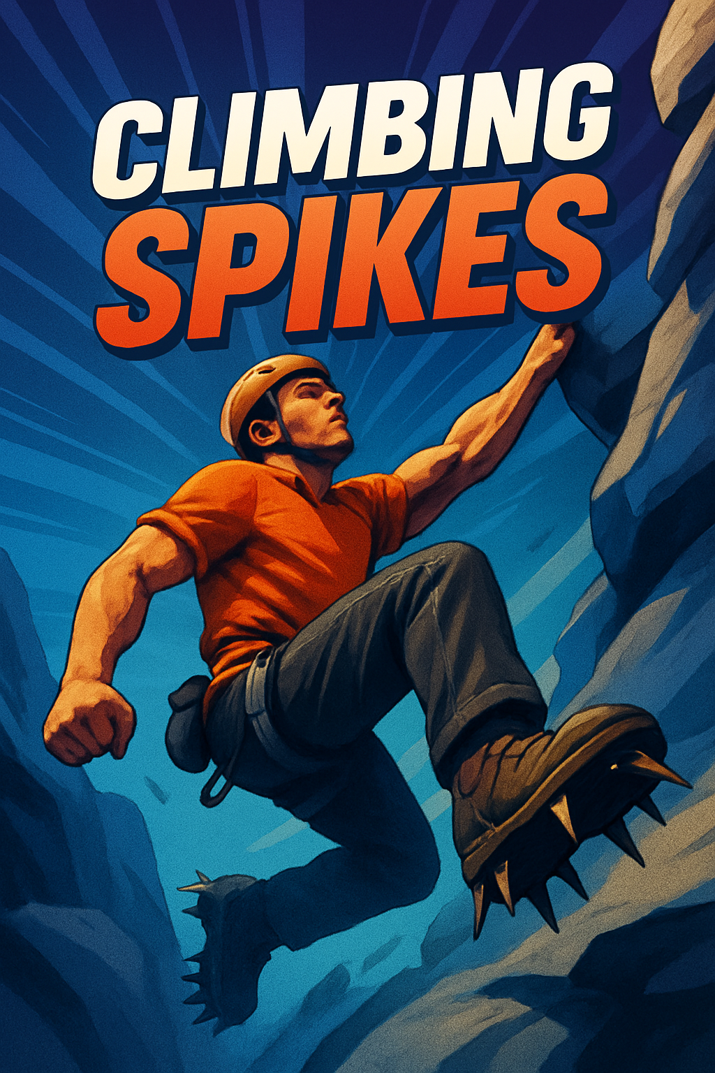 /Collection: /by davooda/Type: PNG/A vibrant illustration of a climber using spikes on a rocky surface, showcasing dynamic movement. The climber, dressed in an orange shirt and helmet, appears to be in action, emphasizing the thrill of extreme climbing.