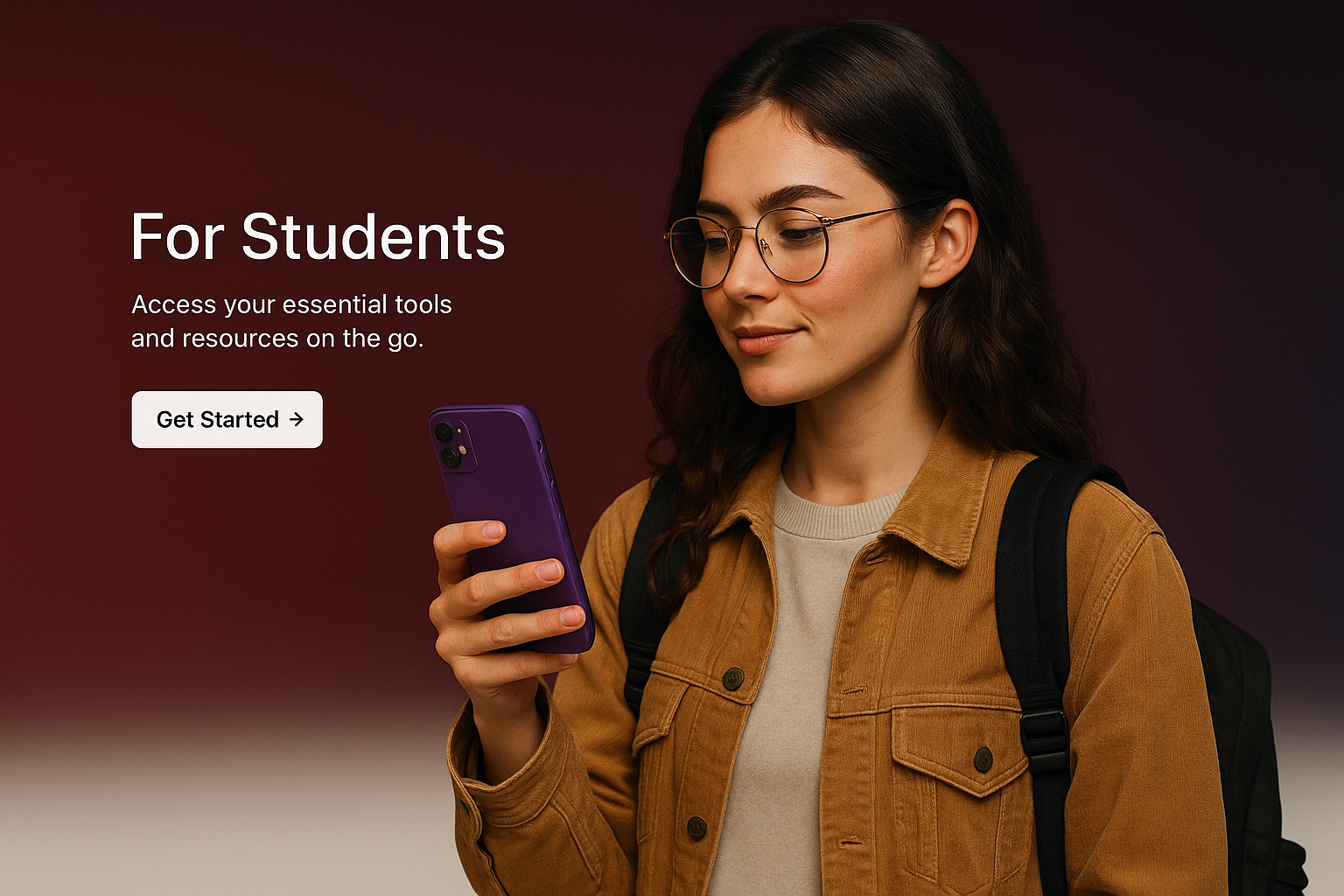 A stylish student wearing glasses holds a purple phone while looking at the screen. She wears a brown jacket and a backpack, set against a gradient background.