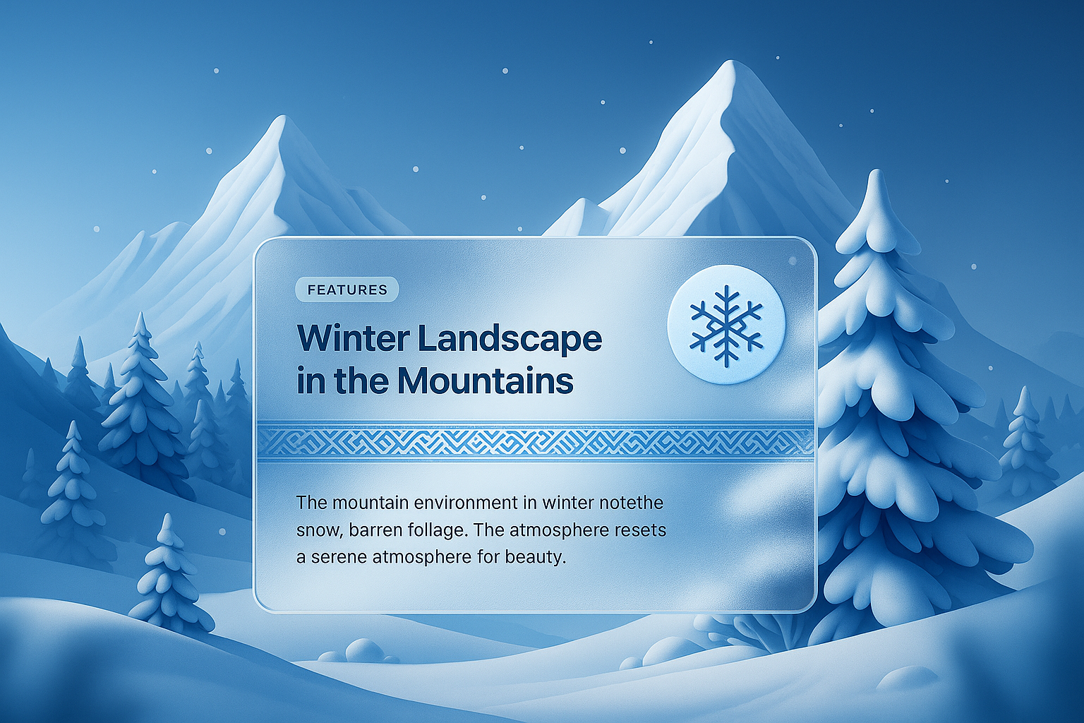 /Collection: /by davooda/Type: PNG/A tranquil winter landscape showcasing majestic mountains covered in snow, with a features block displaying information about the serene environment and its beauty.