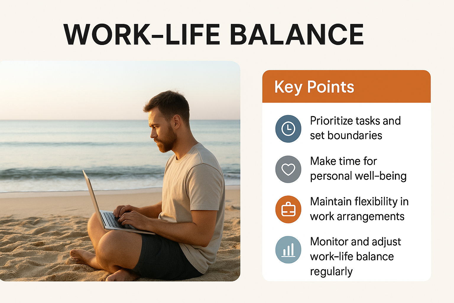 Informative infographic showcasing essential tips for achieving work-life balance, featuring a serene beach setting and clear, modern design elements ideal for personal development.