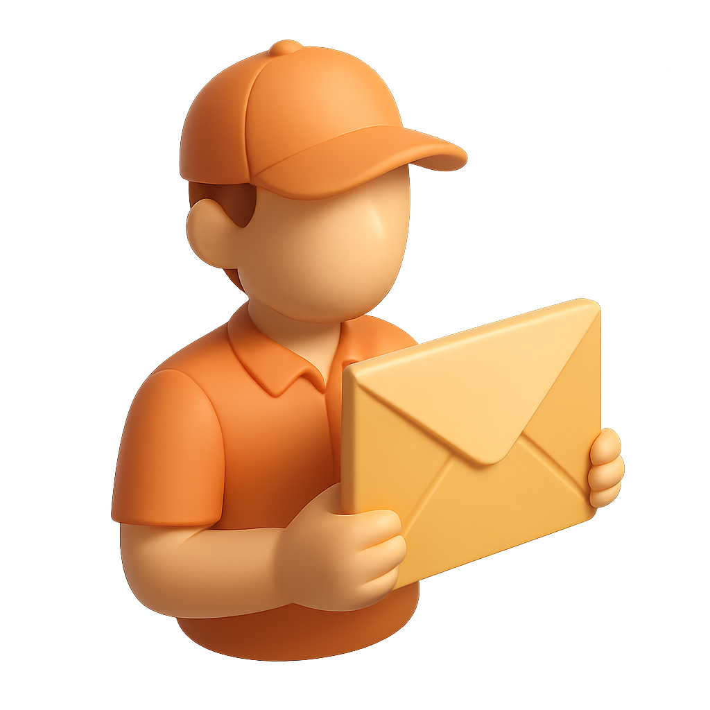 /Collection: /by davooda/Type: PNG/A stylized 3D icon of a courier wearing an orange cap and shirt, holding a yellow envelope. The design features a three-quarter view with a volumetric and isometric style, set against a soft gradient background.