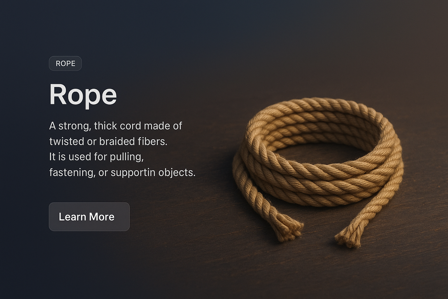 /Collection: /by davooda/Type: PNG/A detailed 3D representation of a twisted rope, zoomed out to showcase its surroundings. The dark gradient background enhances the rope's texture, with clear text labels and a call-to-action button.