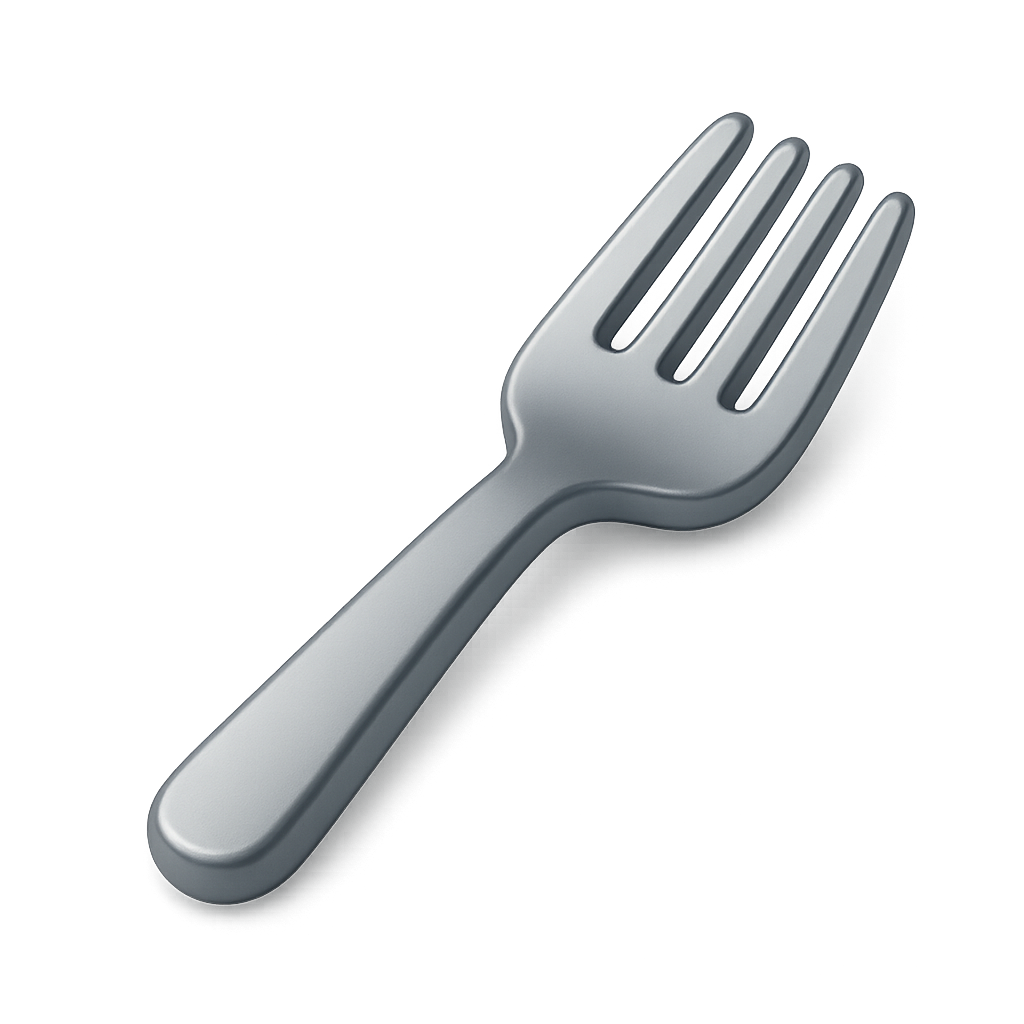 A sleek, isometric 3D representation of a fork, showcasing a modern design with a smooth metallic finish. The fork has four prongs and a rounded handle, set against a subtle gradient background.