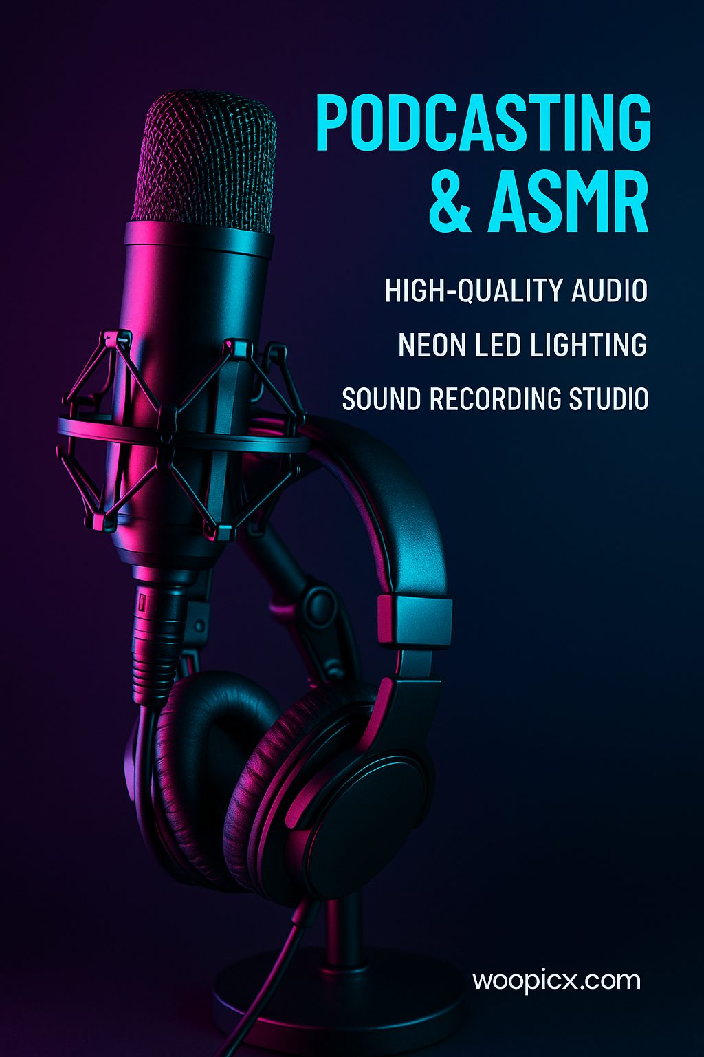 A visually striking image showcasing a microphone and headphones in a dark setting with neon lighting, ideal for promoting podcasting or ASMR services.