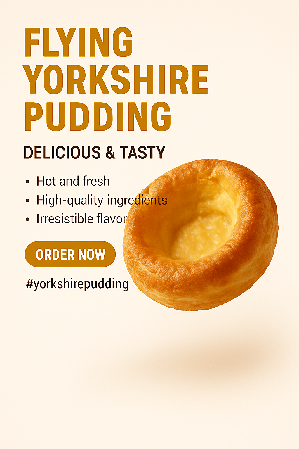 Vibrant promotional graphic showcasing a flying Yorkshire pudding with enticing text, ideal for food marketing and culinary advertisements.