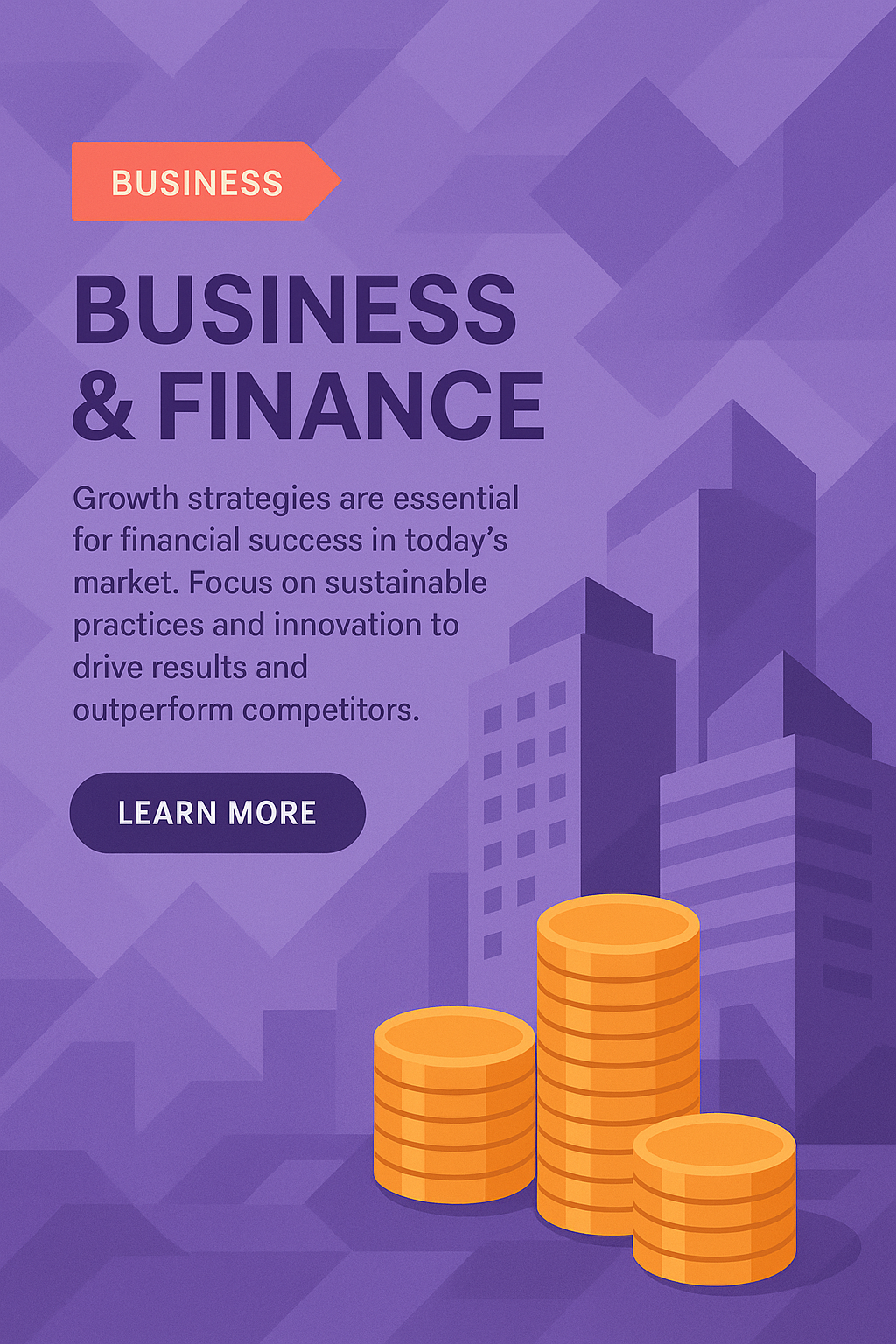 An informative promotional graphic focusing on business and finance strategies. Features a modern design with geometric shapes and a coin stack illustration, ideal for marketing materials.