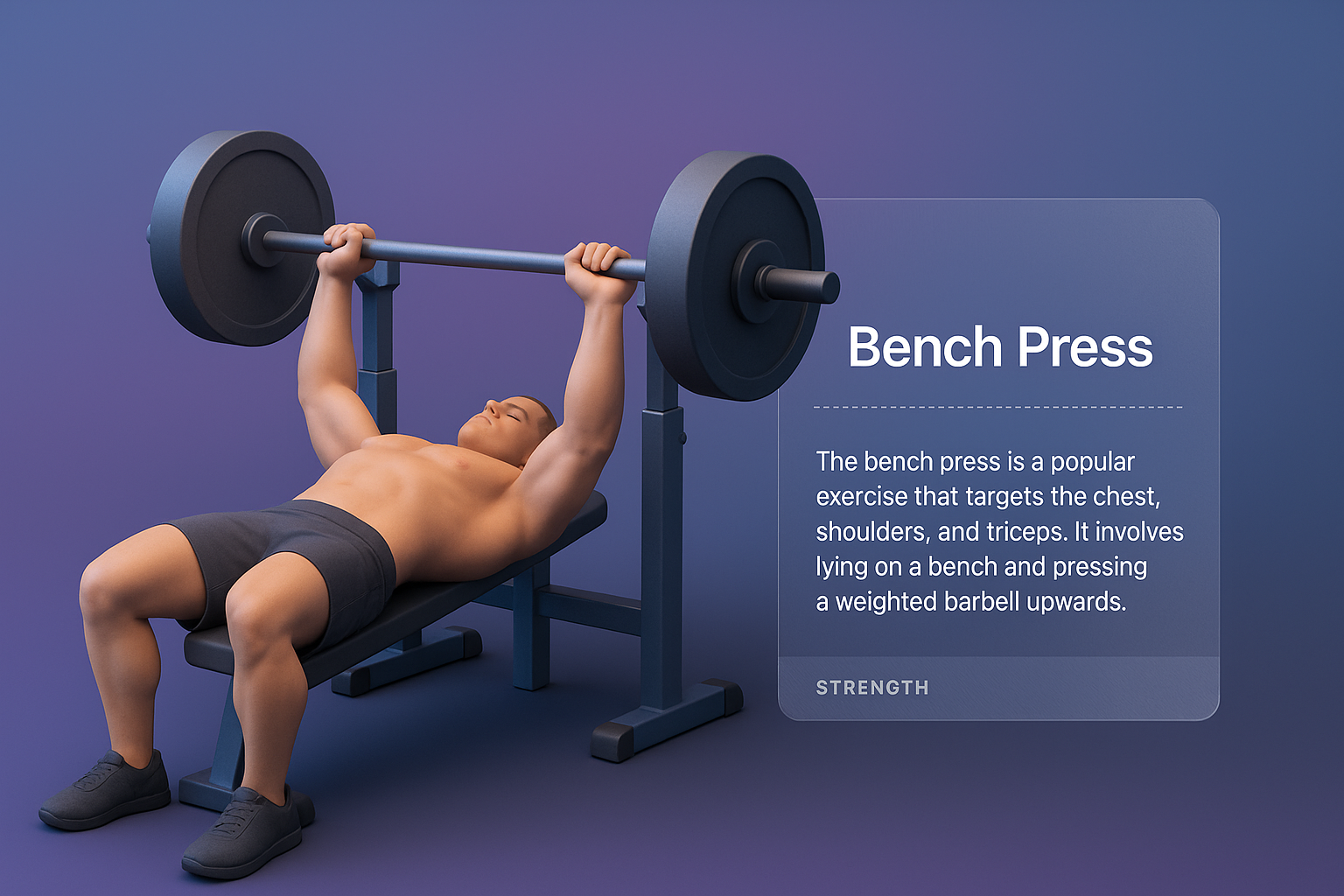 /Collection: /by davooda/Type: PNG/A 3D illustration showcasing a man performing a bench press exercise, combined with a transparent glass block containing descriptive text. The background features a smooth gradient, enhancing the visual appeal.